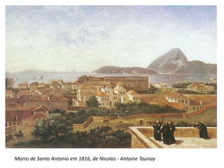 O documento apresenta 10 obras de arte brasileiras dos séculos 18 e 19, incluindo pinturas que retratam a chegada da família real portuguesa ao Brasil em 1808, a coroação de Dom Pedro I como imperador do Brasil, e cenas de paisagens e da vida cotidiana no Brasil colonial e imperial.