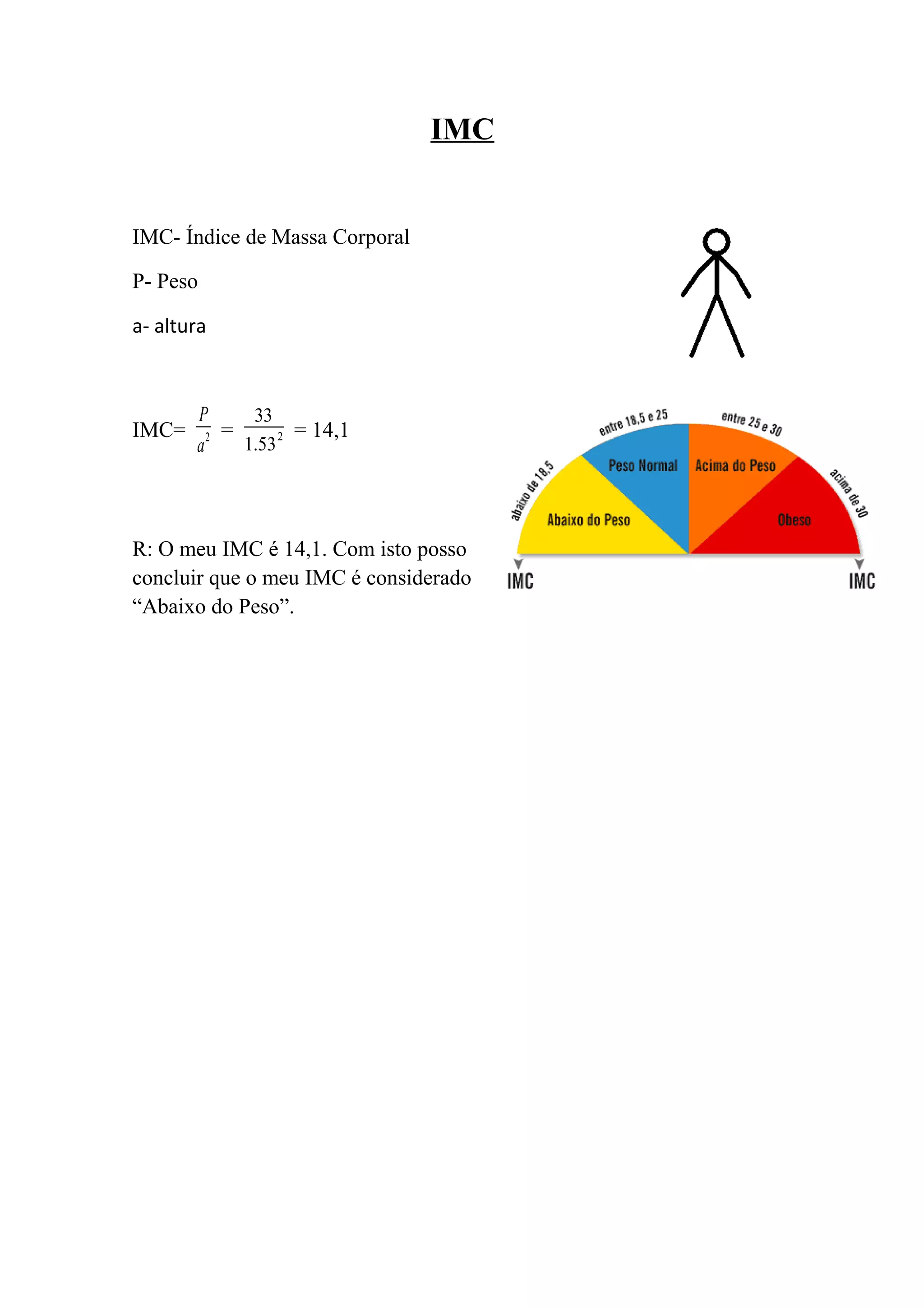 O documento calcula o Índice de Massa Corporal (IMC) de uma pessoa com peso de 33kg e altura de 1,53m, resultando em um IMC de 14,1, indicando que a pessoa está "Abaixo do Peso".