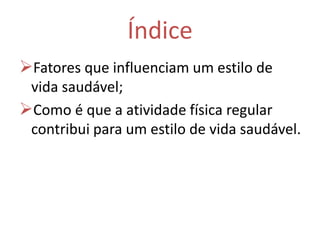 O documento discute como manter um estilo de vida saudável através da atividade física regular e uma dieta equilibrada. Ele define Índice de Massa Corporal (IMC) e explica que exercitar-se por pelo menos 150 minutos por semana pode prevenir doenças como diabetes, obesidade e problemas cardíacos. Também lista vários fatores que influenciam um estilo de vida saudável, como não fumar, comer frutas e vegetais, e ter um IMC entre 18.5 e 24.9.