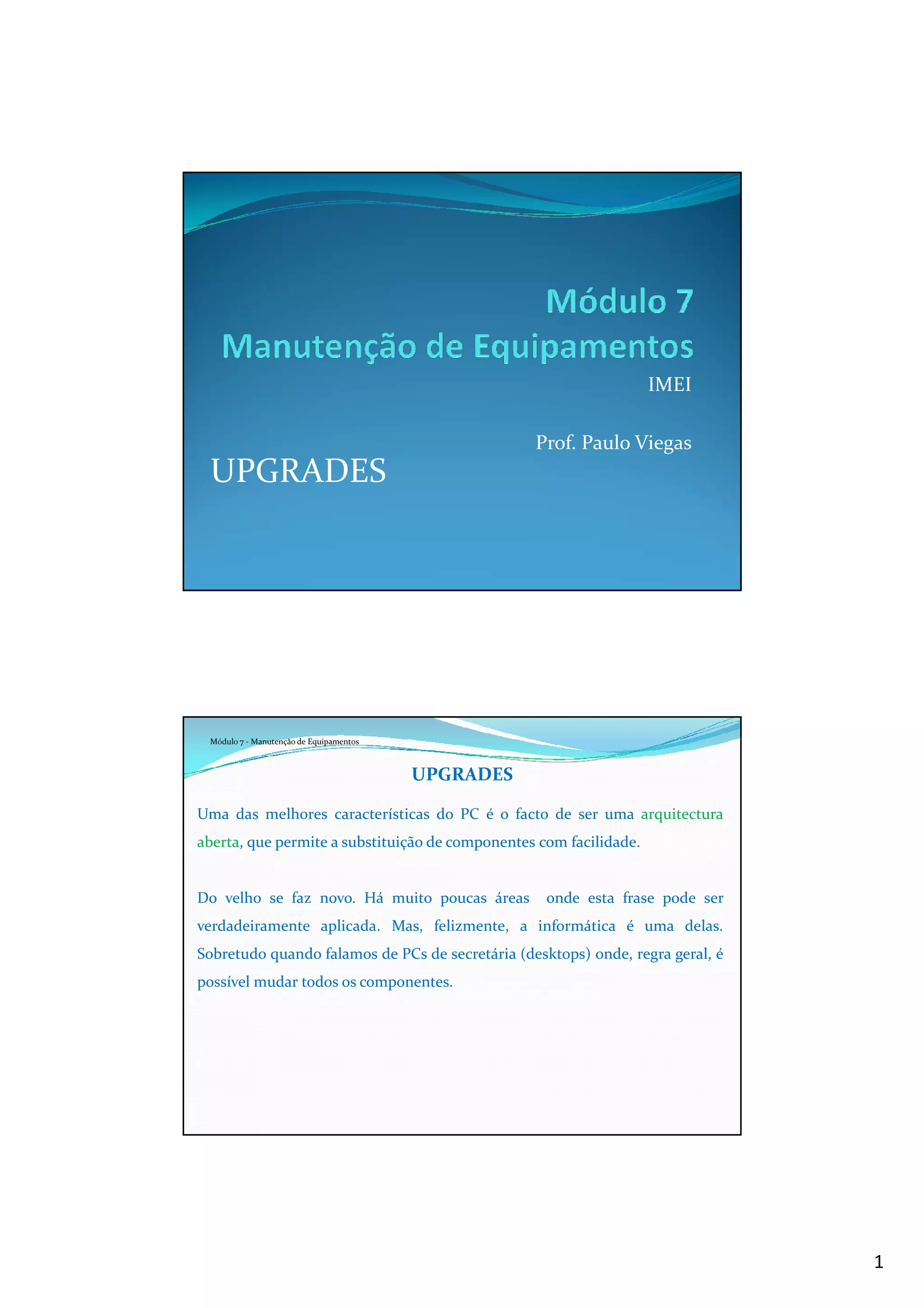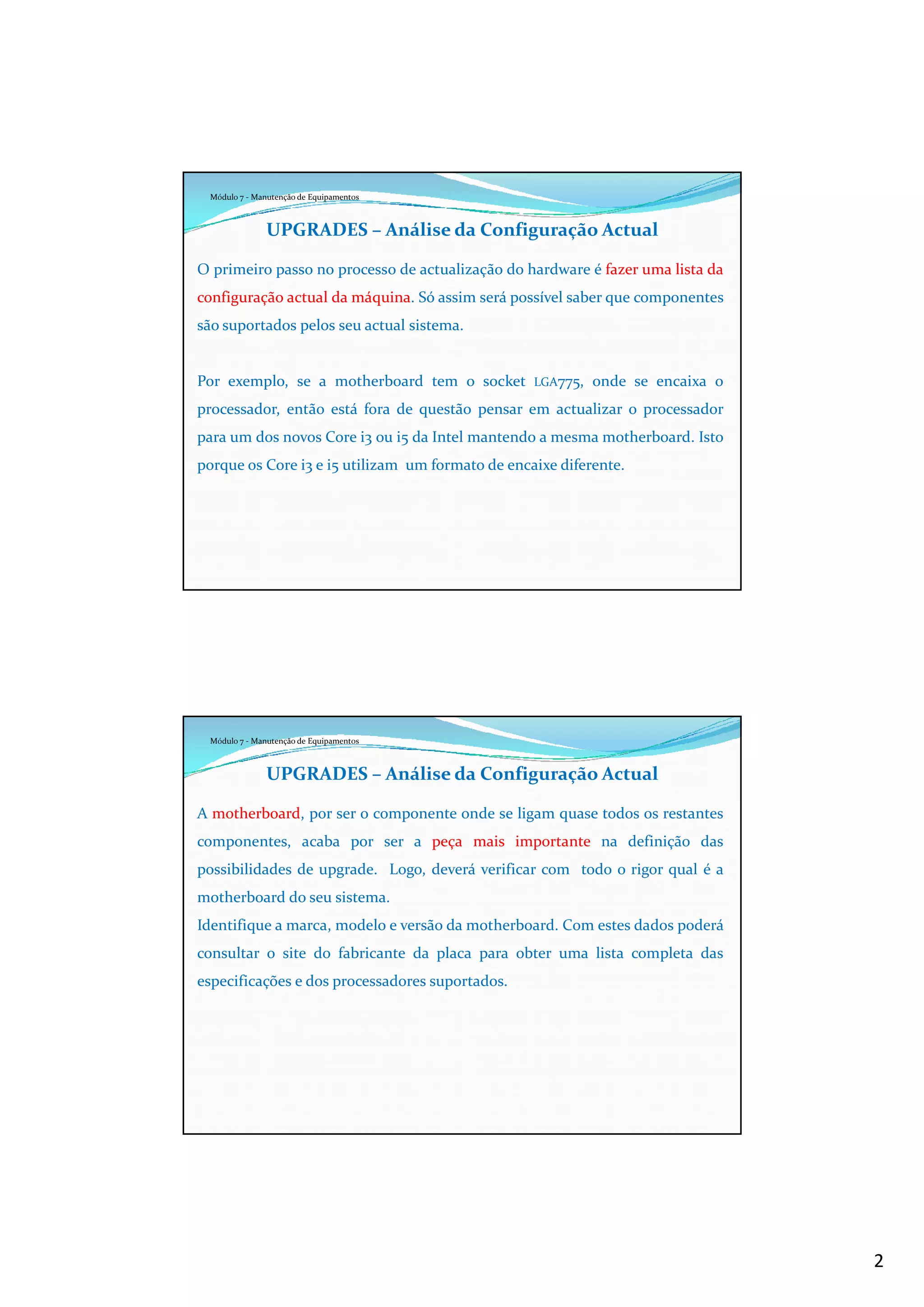 1. O documento discute como atualizar os componentes de hardware de um computador pessoal, como processador, memória RAM, placa gráfica e disco rígido.
