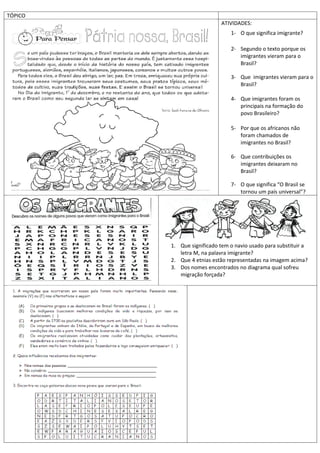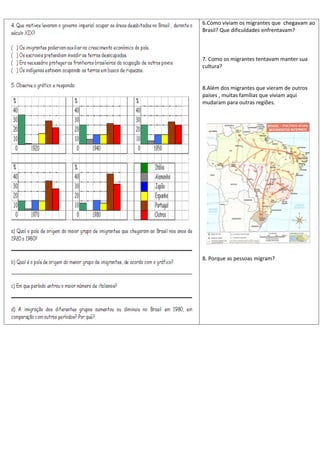 O documento discute a imigração para o Brasil, mencionando que imigrantes vieram para o Brasil em busca de melhores condições de vida e trabalho. Os principais imigrantes que contribuíram para a formação do povo brasileiro foram os europeus, como portugueses, italianos e espanhóis. Apesar de sua importante contribuição, os africanos não foram considerados imigrantes devido à escravidão.