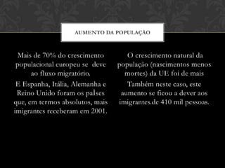3) A população da União Europeia cresceu em apenas 410 mil pessoas devido ao crescimento natural, enquanto o aumento populacional total se deve principalmente aos imigrantes.
