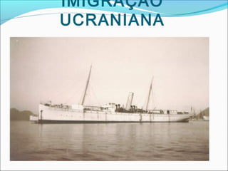 O documento descreve a imigração ucraniana para o Brasil em três etapas, desde o final do século XIX devido a condições socioeconômicas difíceis na Ucrânia. A imigração aumentou após as duas guerras mundiais quando muitos fugiram da guerra e da perseguição. Os imigrantes estabeleceram-se principalmente no Paraná, preservando sua cultura, incluindo danças, músicas, culinária e religião ortodoxa.