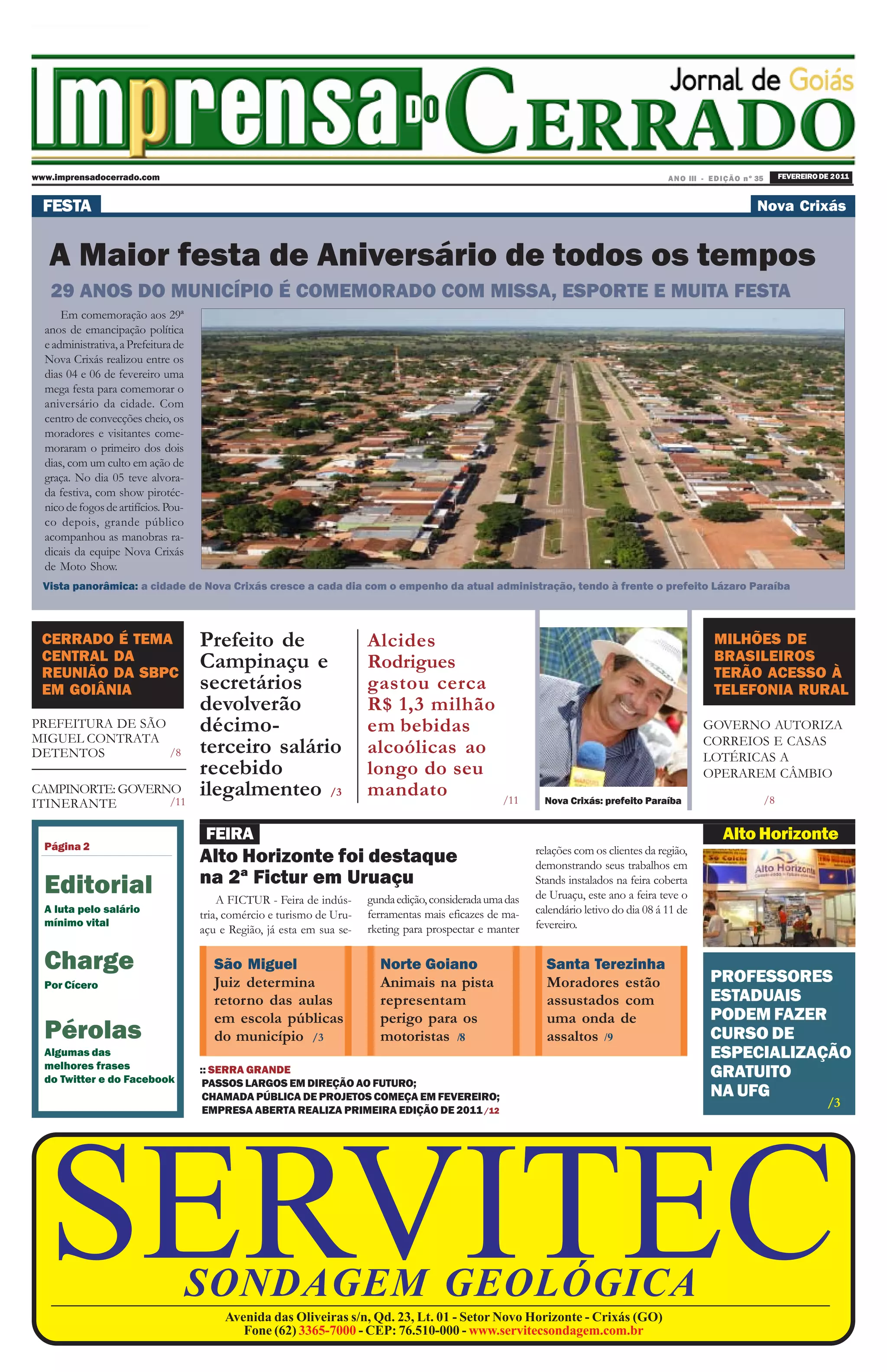 O documento relata três notícias locais: 1) O diretor de uma escola em Campinorte foi preso por suspeita de pedofilia após denúncias de abuso sexual de alunos. 2) O juiz determinou o retorno imediato das aulas nas escolas públicas de São Miguel do Araguaia após greve de professores. 3) A maior festa de aniversário de Nova Crixás ocorreu entre os dias 4-6 de fevereiro para comemorar os 29 anos do município.