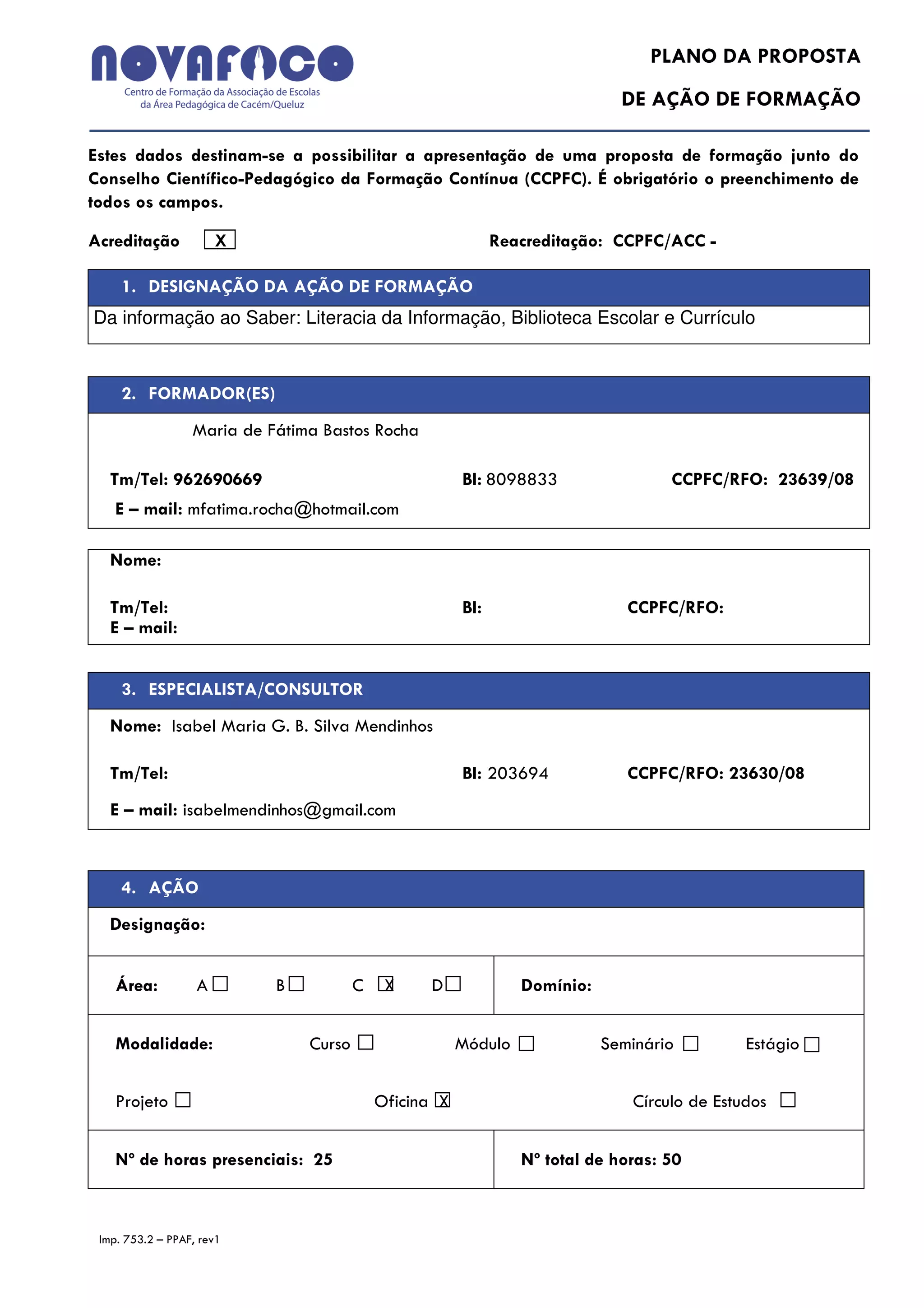 Este documento apresenta um plano de proposta para uma ação de formação sobre literacia da informação, bibliotecas escolares e currículo. O plano descreve os objetivos da formação, os conteúdos, as metodologias, a avaliação dos participantes e da ação, e fornece uma bibliografia relevante. A formação visa desenvolver competências de literacia da informação nos professores e promover a colaboração entre bibliotecas escolares e currículo. Inclui sessões teóricas e práticas sobre vários tópicos