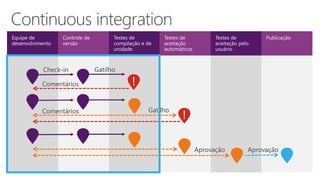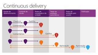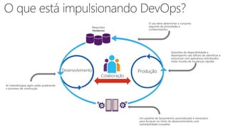 O documento discute o impacto do DevOps nos negócios, destacando sua capacidade de aumentar a agilidade e a colaboração entre as equipes de desenvolvimento e operações. DevOps é descrito como uma metodologia que otimiza o ciclo de vida dos aplicativos, melhorando a qualidade, reduzindo custos e acelerando a entrega de software. Os principais benefícios incluem melhor qualidade nas implantações, alto desempenho e a capacidade de resposta rápida às necessidades de negócios dinâmicas.