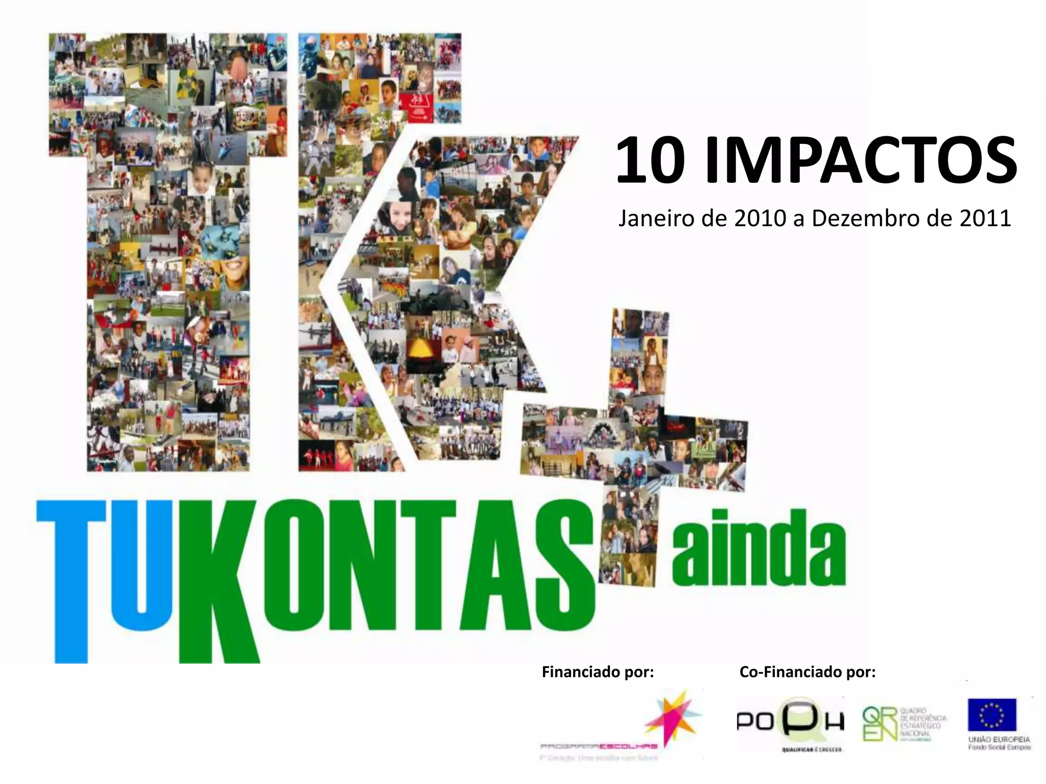 O documento resume 10 impactos de um projeto financiado entre 2010-2011, incluindo aumentar o sucesso escolar de 70% dos alunos, diminuir o abandono escolar, e integrar 87% dos jovens em programas educacionais e profissionais.