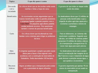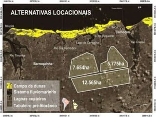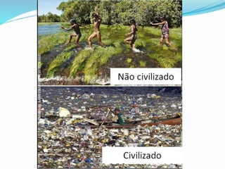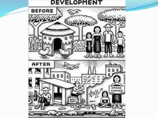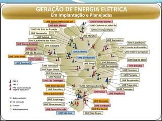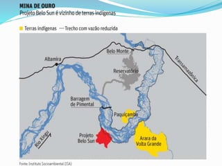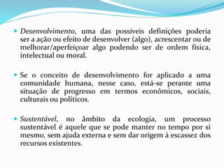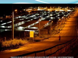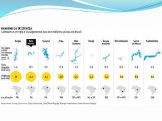 O documento discute o conceito de desenvolvimento sustentável e fornece exemplos de impactos causados por hidrelétricas e outros empreendimentos energéticos no Brasil. Ele aborda os impactos sociais e ambientais de projetos como Belo Monte, Sobradinho e usinas eólicas, e enfatiza a importância de preservar ecossistemas e comunidades locais.