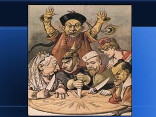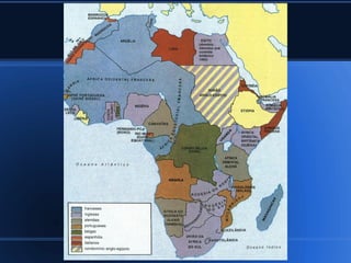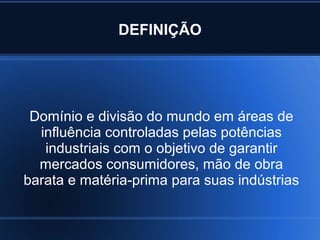 O documento define imperialismo e neocolonialismo, discute suas formas de dominação e contexto histórico no final do século XIX e início do século XX. Grandes potências europeias e os EUA expandiram seu controle sobre a África, Ásia e América Latina em busca de matérias-primas, mercados e mão de obra barata. Essa expansão foi justificada por ideias como o "fardo do homem branco" e o darwinismo social.