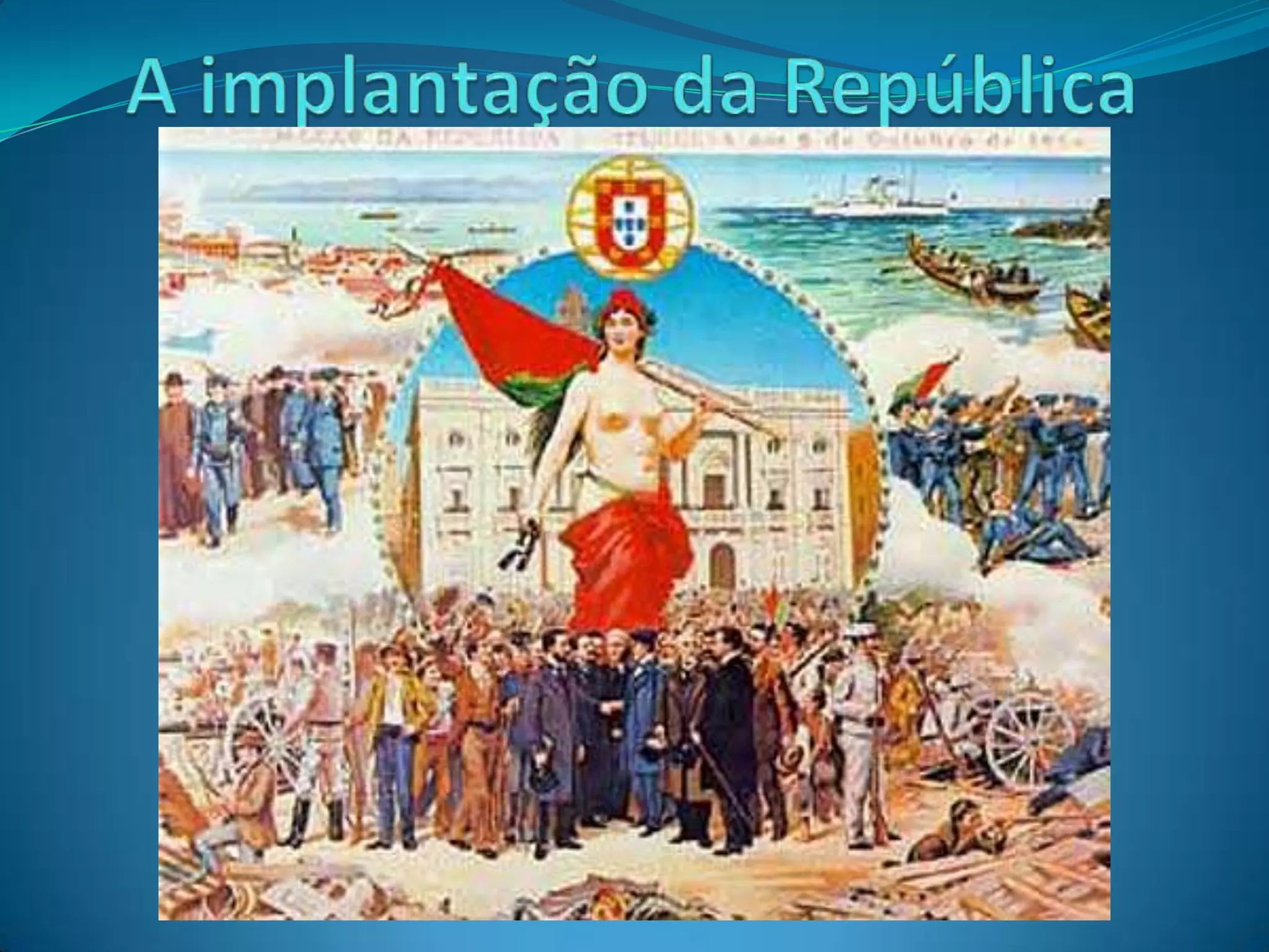 O documento descreve a implantação da República em Portugal após o regicídio de 1908, que marcou o fim da monarquia. Detalha as diferenças entre um rei e um presidente, as primeiras decisões do governo provisório republicano, como a liberdade de imprensa e de greve, e a mudança dos símbolos nacionais como a bandeira e o hino.