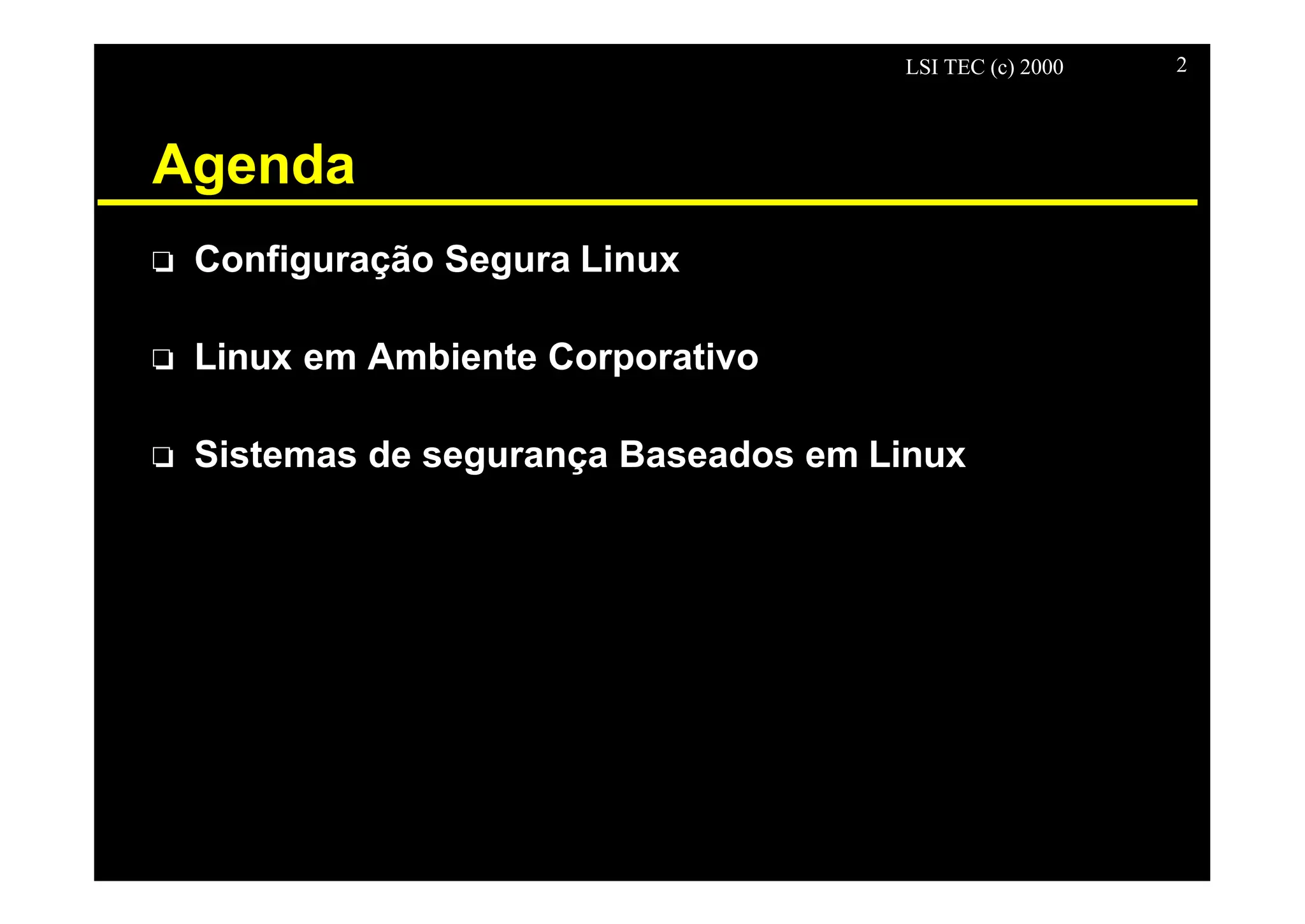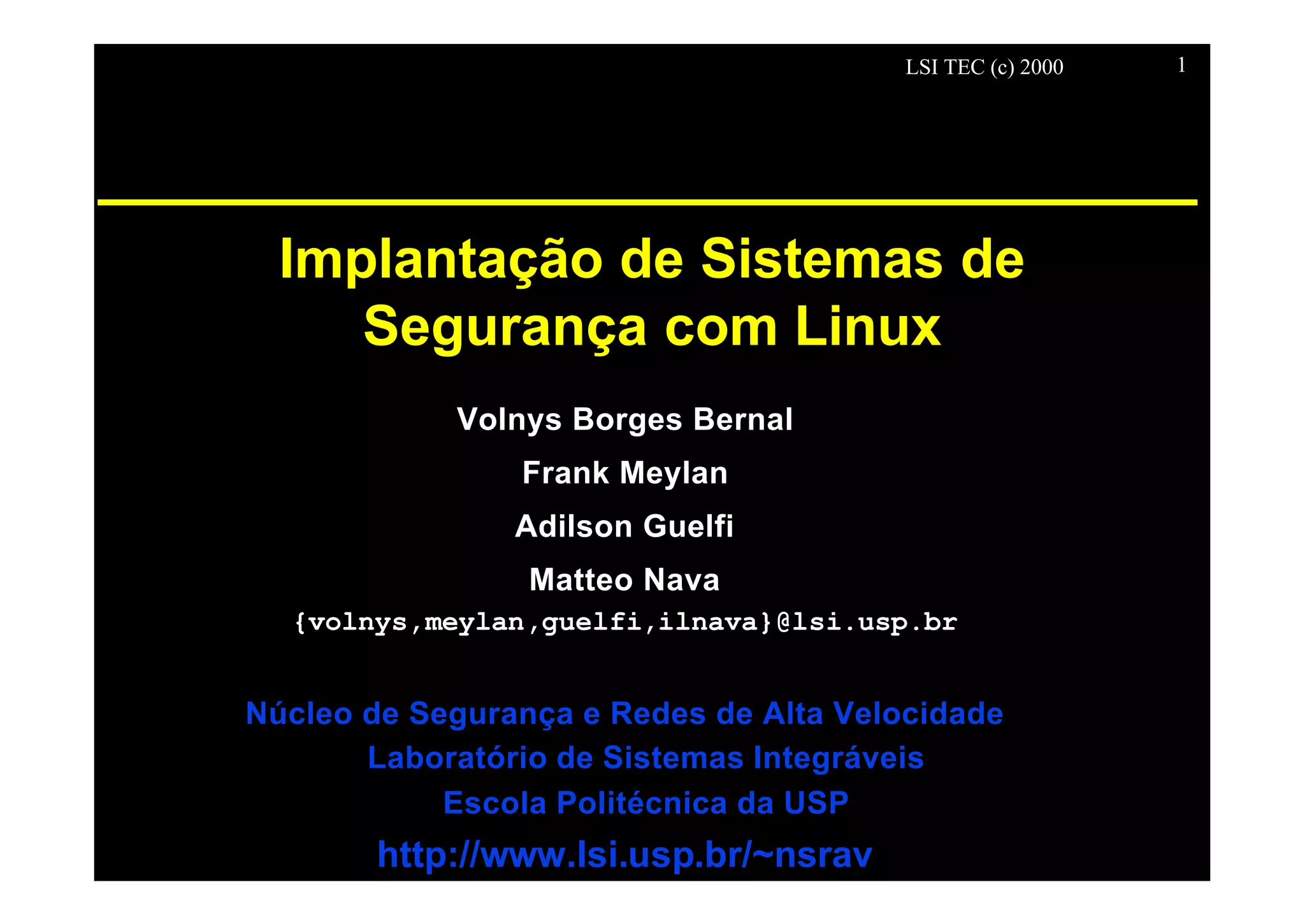 O documento discute a implantação de sistemas de segurança com Linux, abordando tópicos como configuração segura do Linux, uso de Linux em ambientes corporativos e sistemas de segurança baseados em Linux.
