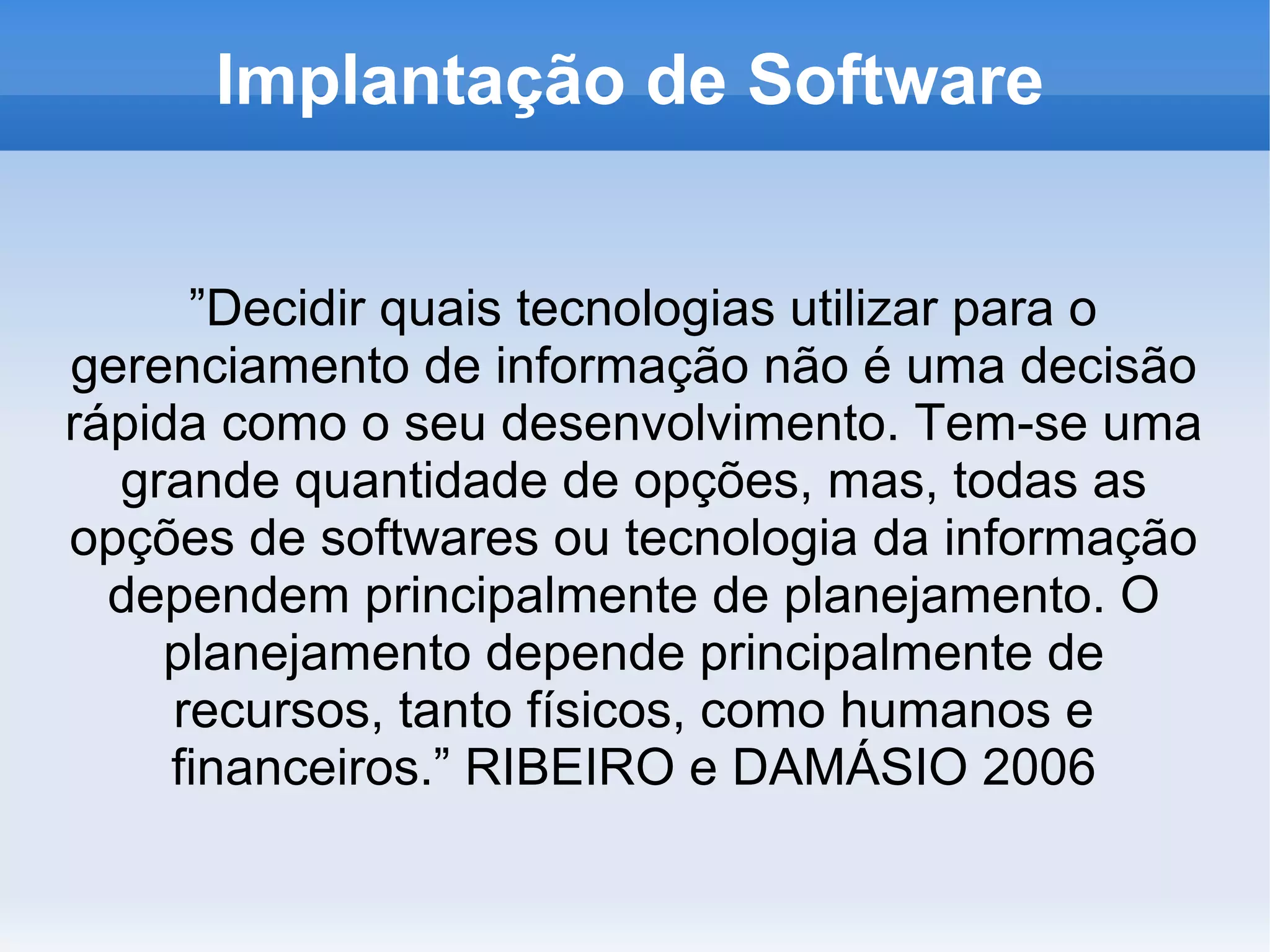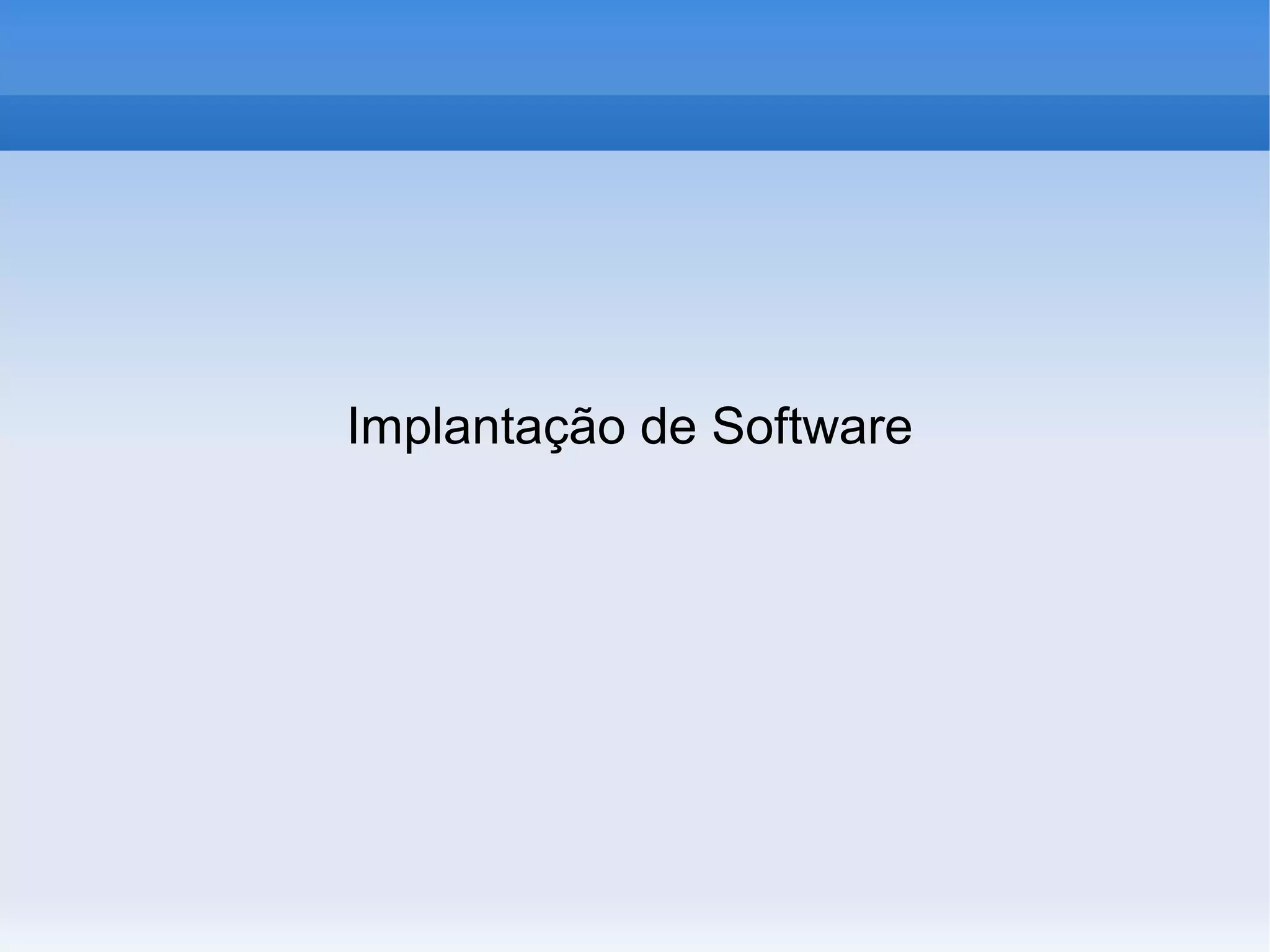 O documento discute a implantação de software, mencionando que a escolha da tecnologia depende principalmente de planejamento levando em conta recursos disponíveis. Também apresenta as origens da computação com a máquina de tabulação de Hollerith e diferentes tipos de licenças de software, proprietárias e livres.