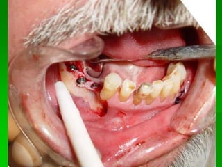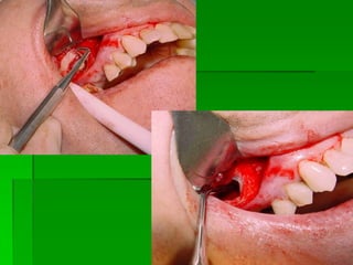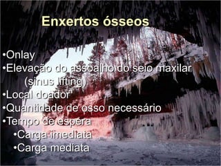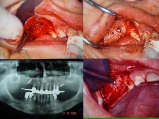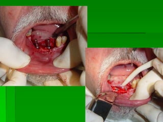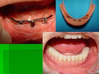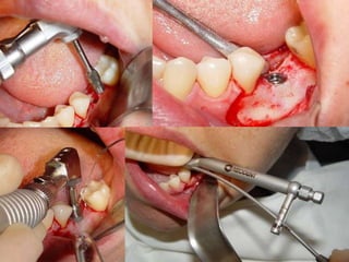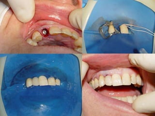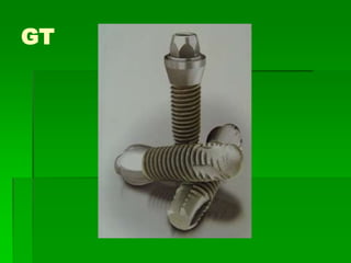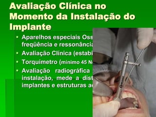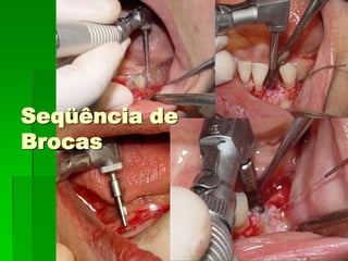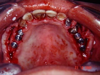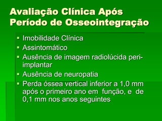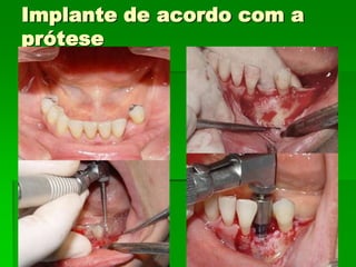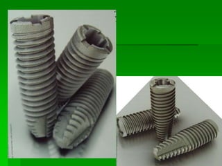 O documento descreve a história dos implantes dentários desde períodos antigos até o desenvolvimento da osteointegração na Suécia na década de 1960. Detalha os tipos de implantes ao longo do tempo, incluindo implantes sub-periostais, agulhados e laminados, e discute fatores que influenciam a osteointegração como superfície do implante e qualidade óssea. Também aborda planejamento, técnicas e avaliação de implantes dentários.