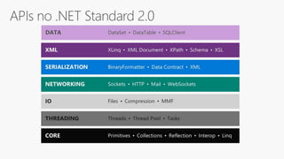 O documento aborda a implementação de APIs REST utilizando ASP.NET Core 2.0, destacando sua multiplataforma e a reescrita completa do framework. Inclui uma visão geral das ferramentas e editores disponíveis, exemplos práticos como autenticação com JWT e documentações com Swagger. Também menciona o uso de containers Docker e recursos avançados de acesso a dados com EF Core e Dapper.