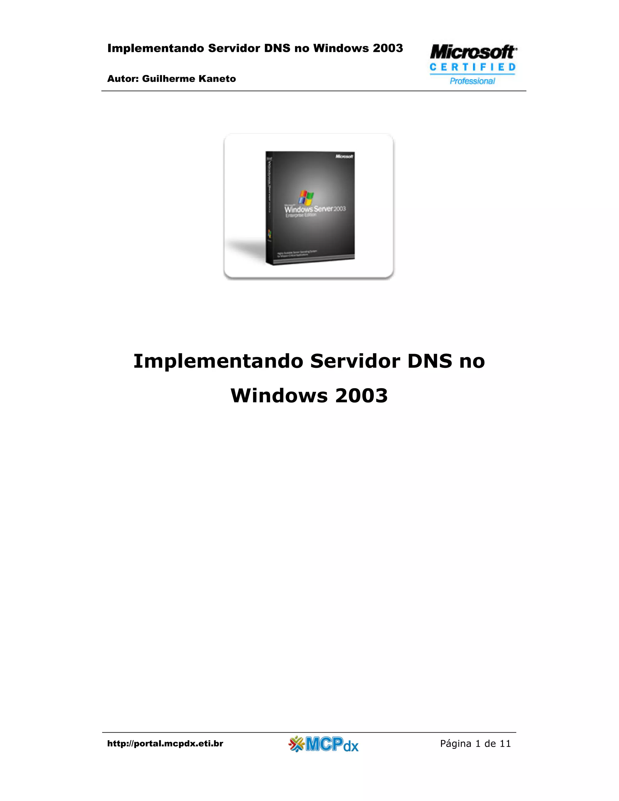 O documento descreve como implementar um servidor DNS no Windows 2003, incluindo instalar o serviço DNS, configurar o servidor e zonas forward e reversa, criar um host e testar a configuração.