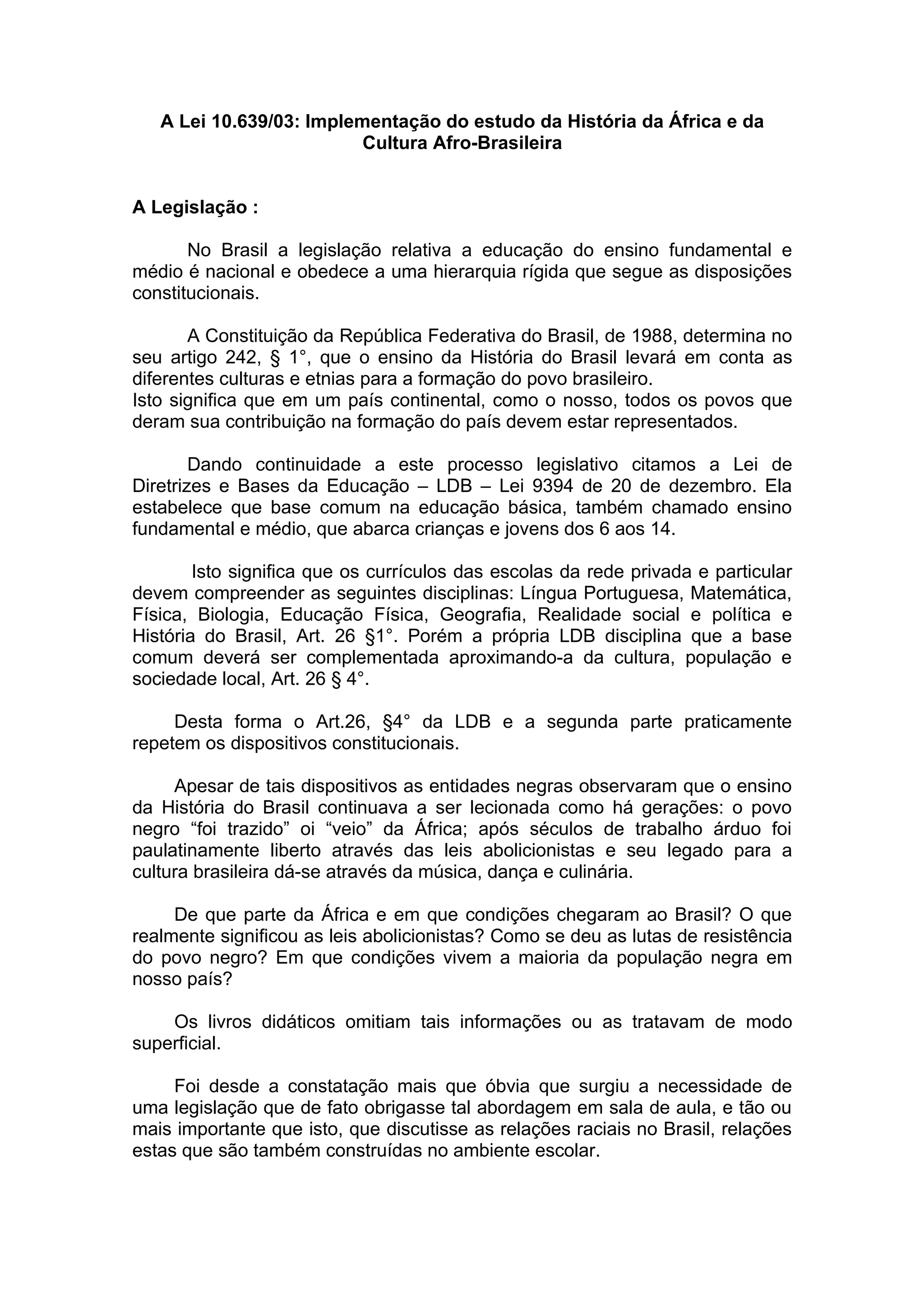 A Lei 10.639/03 torna obrigatório o ensino da História e Cultura Afro-Brasileira nas escolas brasileiras. No entanto, sua implementação enfrenta desafios como falta de conhecimento da lei, desvalorização de sua importância e falta de qualificação dos professores. Experiências em cidades como Recife, Olinda e Goiana têm tido êxito ao capacitar professores e desenvolver material didático adequado.