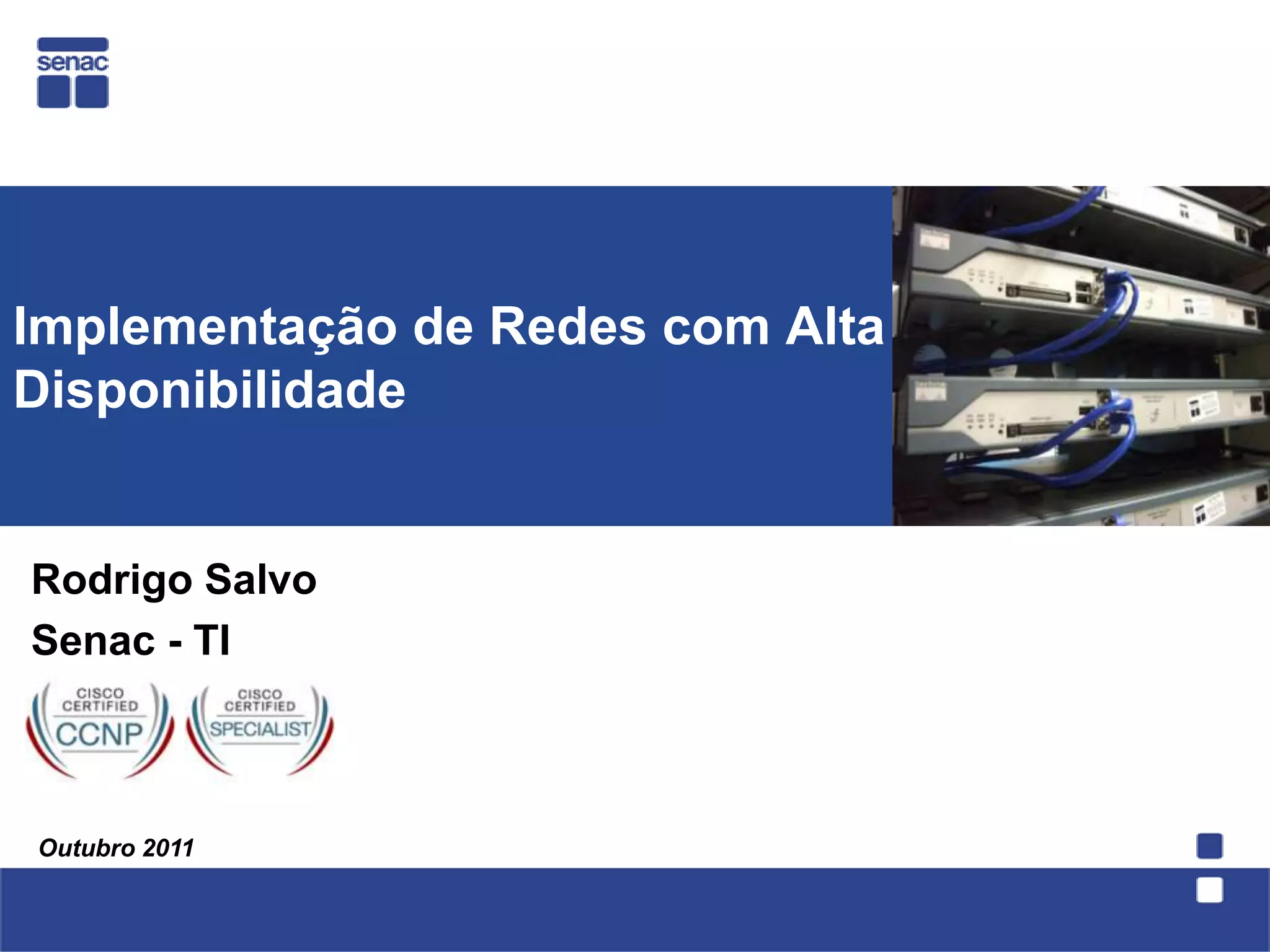 O documento aborda a implementação de redes com alta disponibilidade, discutindo a identificação e a mitigação de pontos de falha em topologias de rede. Exemplos práticos incluem as configurações de HSRP e GLBP para gateways, além de técnicas de redundância usando switches. Também são fornecidos recursos adicionais e referências para treinamento na área de redes.