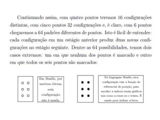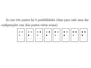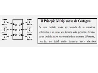 1) O documento discute estratégias para ensinar combinatória, incluindo começar com problemas simples em vez de fórmulas complexas e aprender com erros. 2) Apresenta exemplos de problemas de combinatória e suas soluções usando princípios como aditividade e multiplicatividade. 3) Explica que a abordagem deve dividir problemas em decisões mais simples e não adiar dificuldades.