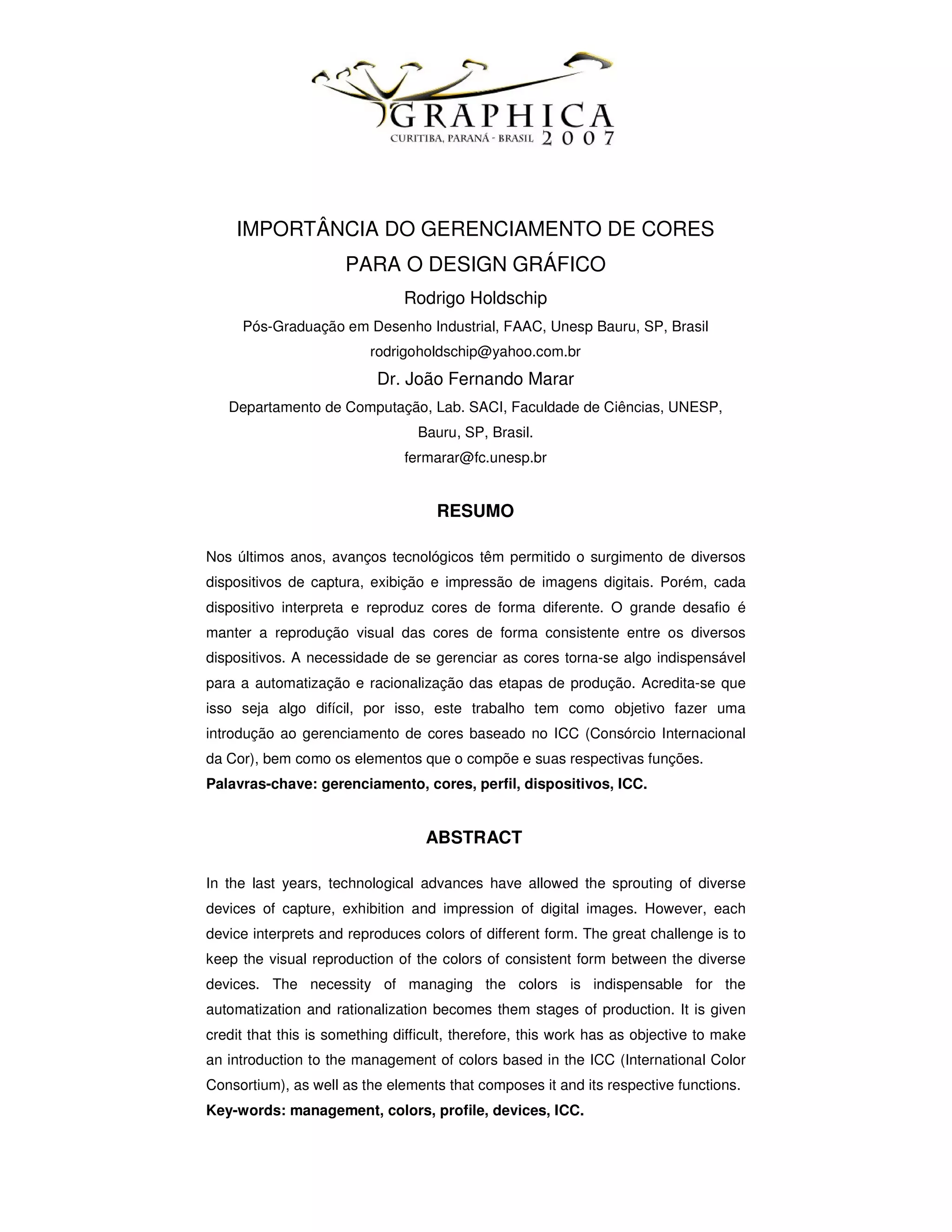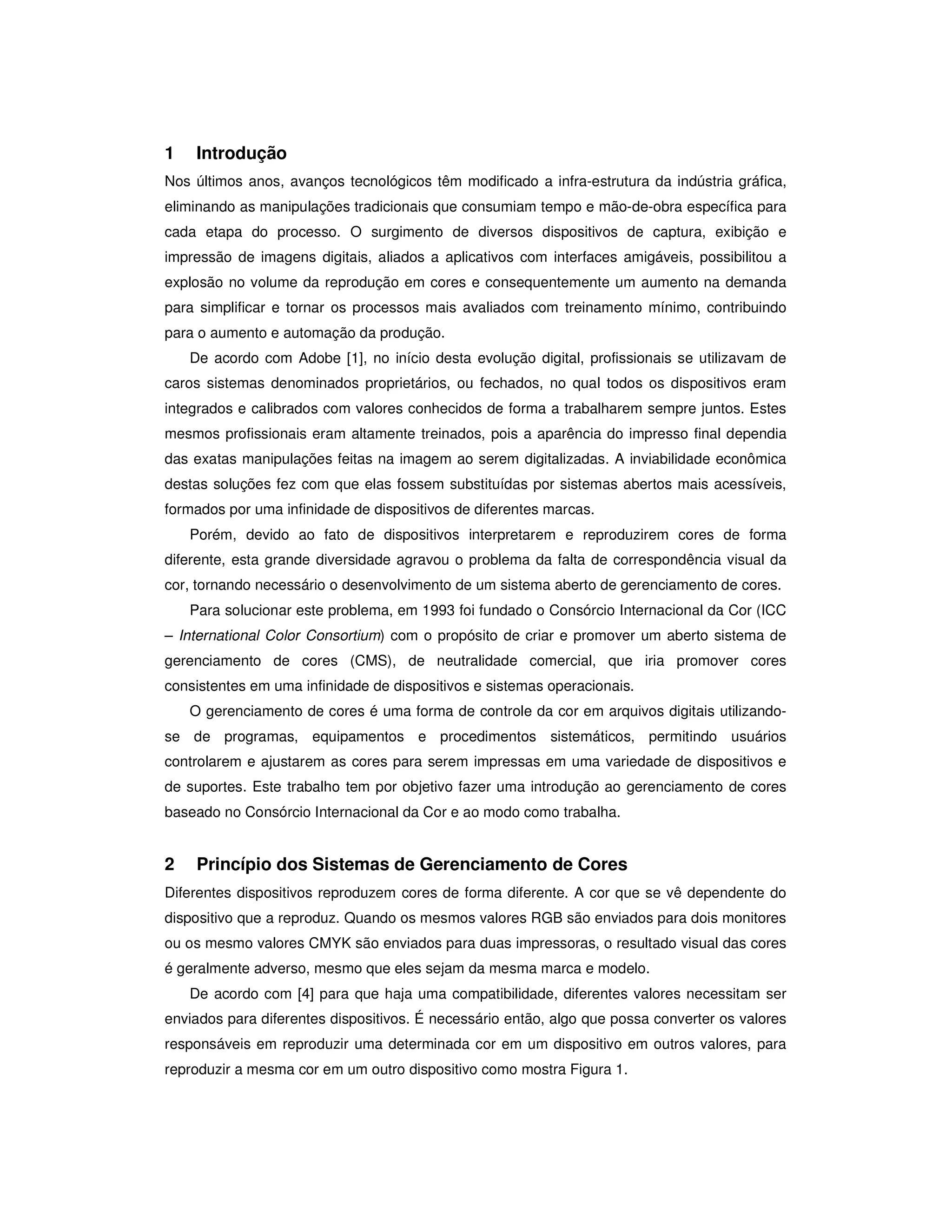 Este documento discute a importância do gerenciamento de cores para o design gráfico. Explica que cada dispositivo interpreta e reproduz cores de forma diferente, criando o desafio de manter a reprodução visual consistente entre dispositivos. Detalha os principais componentes do gerenciamento de cores, incluindo espaço de conexão entre perfis, perfis de cores, o Consórcio Internacional da Cor e objetivos de acabamento. O objetivo é introduzir o conceito de gerenciamento de cores baseado no ICC para promover a consistência de cores entre diversos dis
