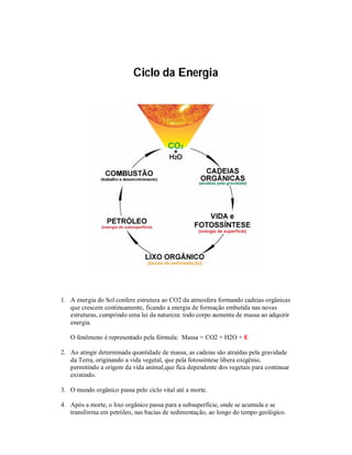 1) O autor defende que as emissões de CO2 são necessárias para manter a vida no planeta, ao invés de serem causadoras do aquecimento global. 2) Ele propõe o "Ciclo da Energia" onde o petróleo é formado a partir de matéria orgânica que capturou energia solar e 3) Argumenta que queimar petróleo devolve CO2 para a atmosfera e ajuda a equilibrar a quantidade necessária para a fotossíntese.