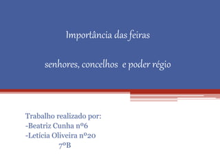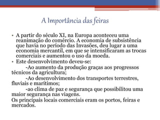 O documento discute a importância das feiras e mercados na economia medieval, o desenvolvimento dos senhores, concelhos e poder régio. Resume que as feiras e mercados promoveram o comércio e trocas, gerando renda para os reis, enquanto os senhores e concelhos exerciam poder localmente e os reis tomaram medidas para fortalecer a coroa central.