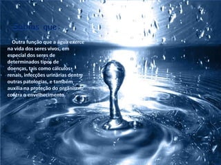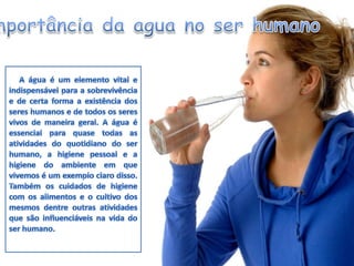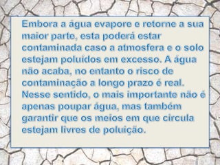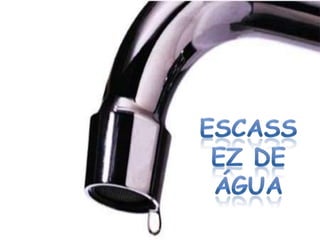 O documento discute a escassez global de água doce, notando que metade da água doce disponível já é utilizada e que a média mundial de água disponível por habitante diminuirá um terço nos próximos 20 anos. Isso significa que duas em cada três pessoas terão que viver com escassez grave de água, principalmente na África, Ásia Central e Oriente Médio. O documento também fornece dicas para poupar água no banho, escovação de dentes e tarefas domésticas.