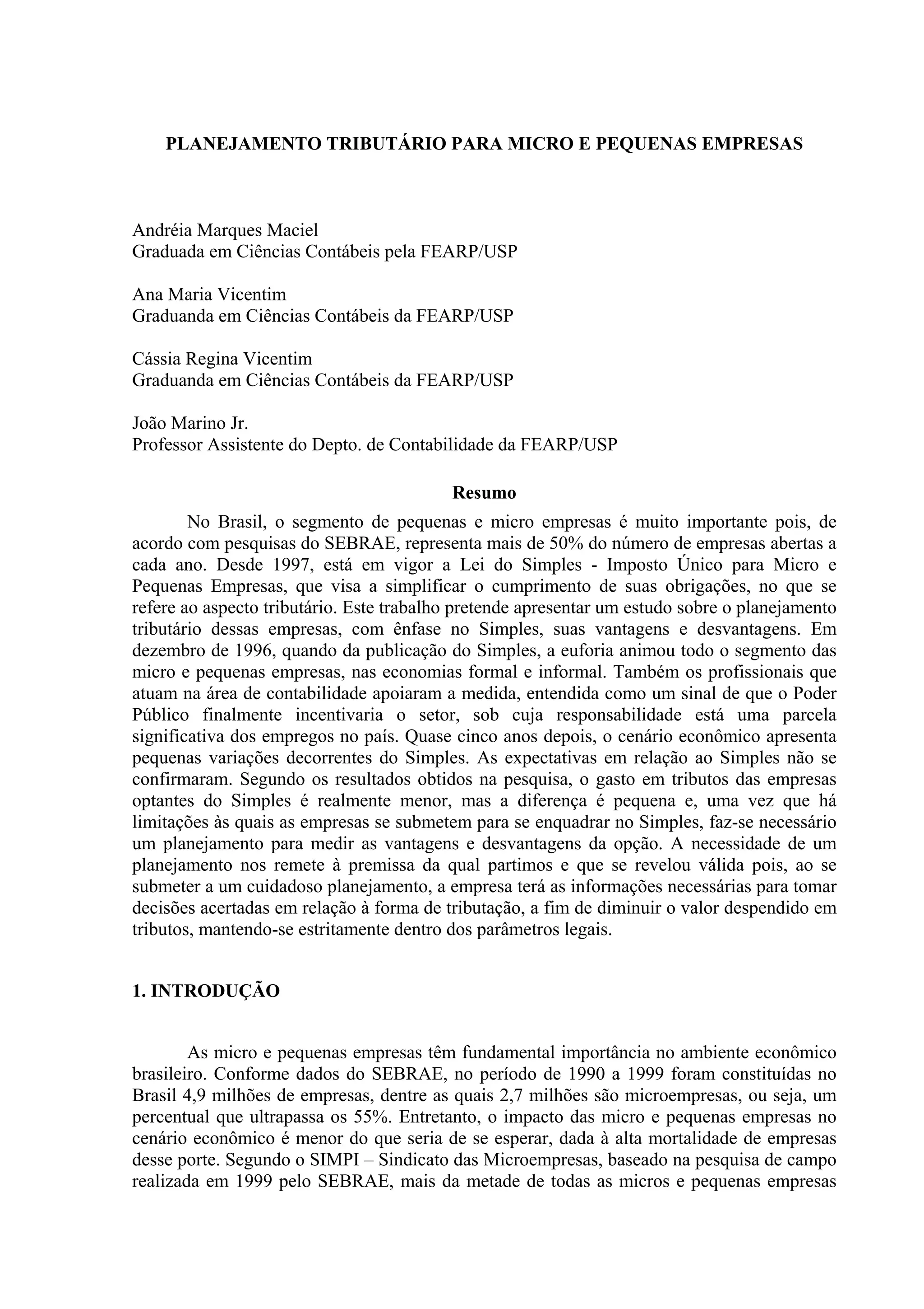 O documento discute planejamento tributário para micro e pequenas empresas no Brasil. Apresenta o regime tributário Simples como forma de simplificar obrigações fiscais para essas empresas e discute suas vantagens e desvantagens. Também aborda outros tributos que incidem sobre micro e pequenas empresas e a importância desse segmento para a economia brasileira.