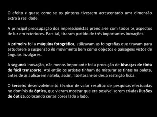 O Impressionismo surgiu na França no século XIX como um gênero revolucionário de pintura. Os impressionistas pintavam cenas externas diretamente, captando a luz e as cores como percebiam no momento. Eles usavam novas técnicas como pintar fora de estúdio e tintas em bisnagas para captar melhor as impressões visuais do ambiente.