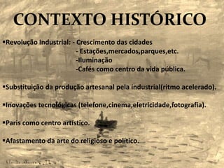 O documento descreve o movimento artístico do Impressionismo no século XIX, incluindo seu contexto histórico e características. Detalha os principais artistas como Monet, Renoir e Degas e suas obras, e introduz o estilo relacionado do Pontilhismo.