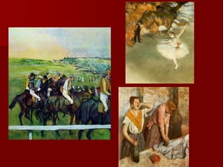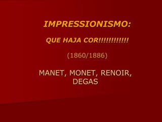 O documento aborda o impressionismo, um movimento artístico francês entre 1860 e 1886, destacando artistas como Monet, Renoir e Degas, que buscavam capturar sensações visuais através da cor e da luz. Essa corrente revolucionou a arte ao enfatizar a 'impressão' como a percepção sensorial inicial do artista. O termo 'impressionismo' foi originado de uma crítica a Monet, nome que acabou se consolidando para identificar o grupo de artistas.