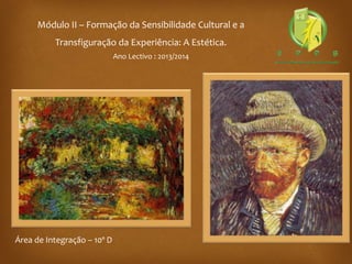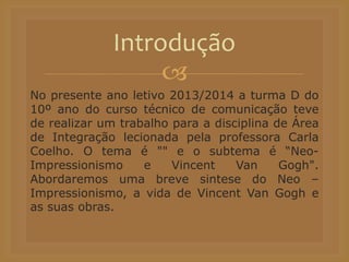 O documento apresenta um resumo sobre o trabalho realizado pela turma D do 10o ano sobre o tema "Neo-Impressionismo e Vincent Van Gogh", abordando uma breve síntese do Neo-Impressionismo, a vida e obras de Van Gogh. É descrita a biografia de Van Gogh, desde a infância até o fim da vida, com ênfase nos locais onde viveu e trabalhou, assim como suas principais obras pictóricas.