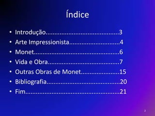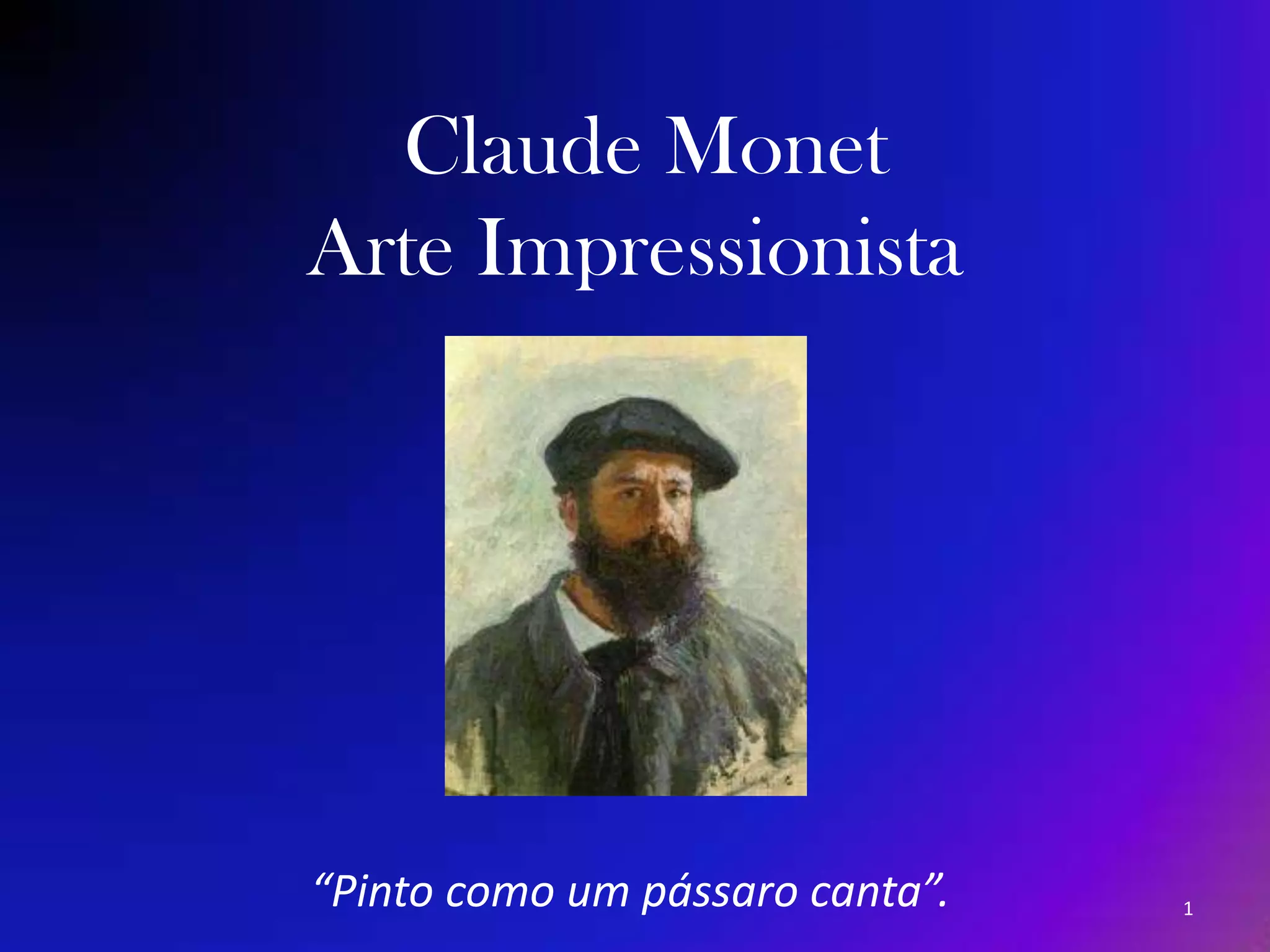 O documento fornece um resumo da vida e obra do pintor impressionista Claude Monet. Descreve sua infância, educação artística, amizades com outros pintores impressionistas, principais obras como as séries de pinturas de catedrais, estações de trem e jardins com nenúfares. Destaca como Monet foi um pioneiro na representação da luz e cores da natureza.