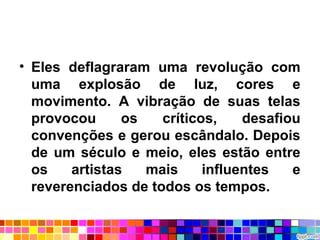 O documento descreve o surgimento e características principais do movimento impressionista e neoimpressionista na França do século XIX. O impressionismo revolucionou a arte ao priorizar a captura da luz, cor e movimento em pinturas de cenas do cotidiano, enquanto o neoimpressionismo desenvolveu uma nova técnica de aplicação de pontos de cor pura nas telas. Artistas como Monet, Renoir, Degas e Seurat são exemplos destes movimentos que influenciaram profundamente a arte moderna.