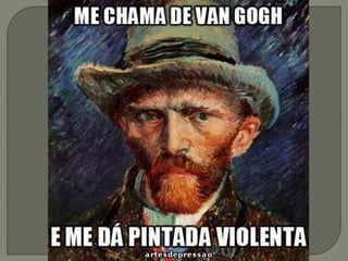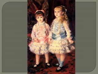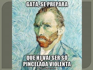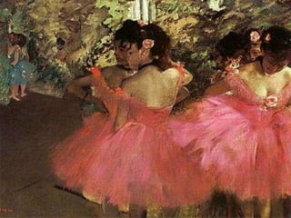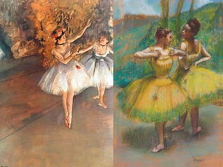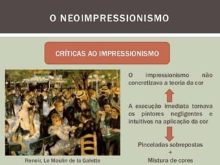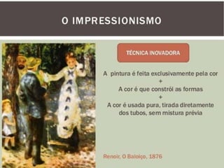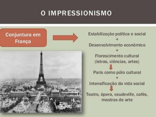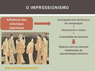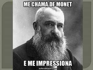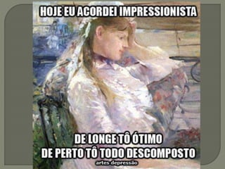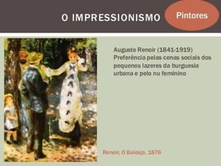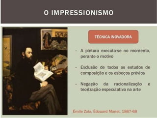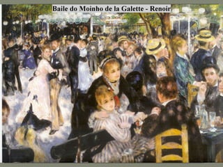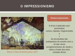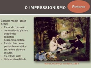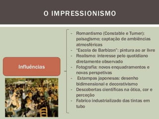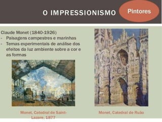 O documento lista obras de arte e seus artistas como Olympia de Manet, Nascer do Sol de Monet, Catedral de Ruão na França, Madame Monet e filho e La Grenouillère. Também menciona a Ponte Japonesa e Aula de Dança. Fornece links para vídeos sobre Expressionismo e o quadro O Grito de Edvard Munch.
