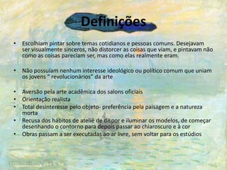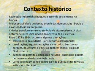 O documento aborda o impressionismo e o pós-impressionismo, destacando o contexto histórico da revolução industrial na França e a ascensão da burguesia como núcleo da vida moderna. O movimento, que surgiu no século XIX, promoveu uma nova visão da natureza através de pinceladas soltas e ênfase na luz, afastando-se das tradições artísticas anteriores. Artistas como Monet, Degas e Renoir buscavam retratar a vida cotidiana e a natureza com uma abordagem mais intuitiva e perceptiva, influenciando futuras correntes artísticas como o neo-impressionismo e o simbolismo.