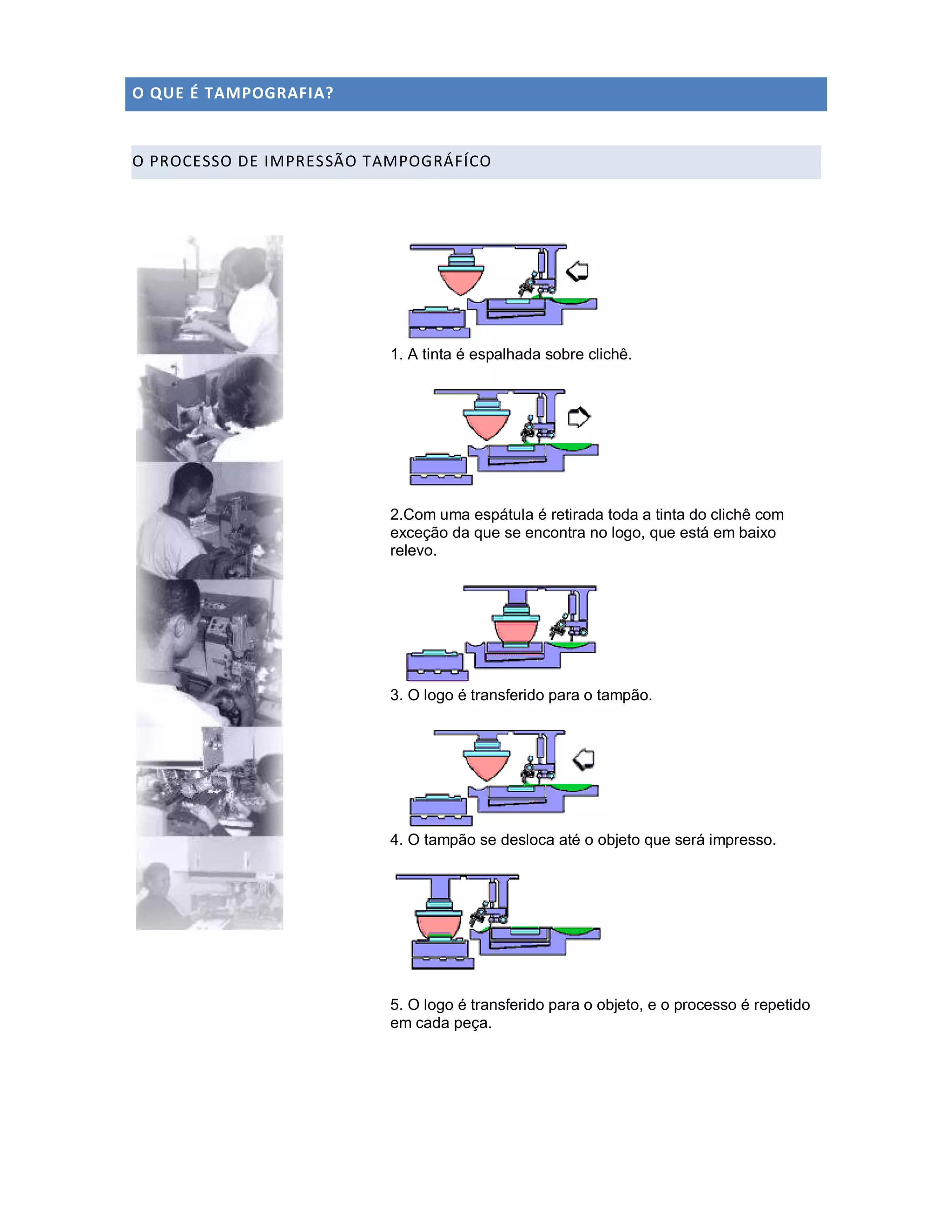 A tampografia é um processo de impressão indireta que transfere um logo em relevo de um clichê para um tampão e então para o objeto a ser impresso, permitindo detalhes de alta qualidade em pequenas peças. A Memory Brindes usa tampografia para impressão em mostradores de relógio e canetas.