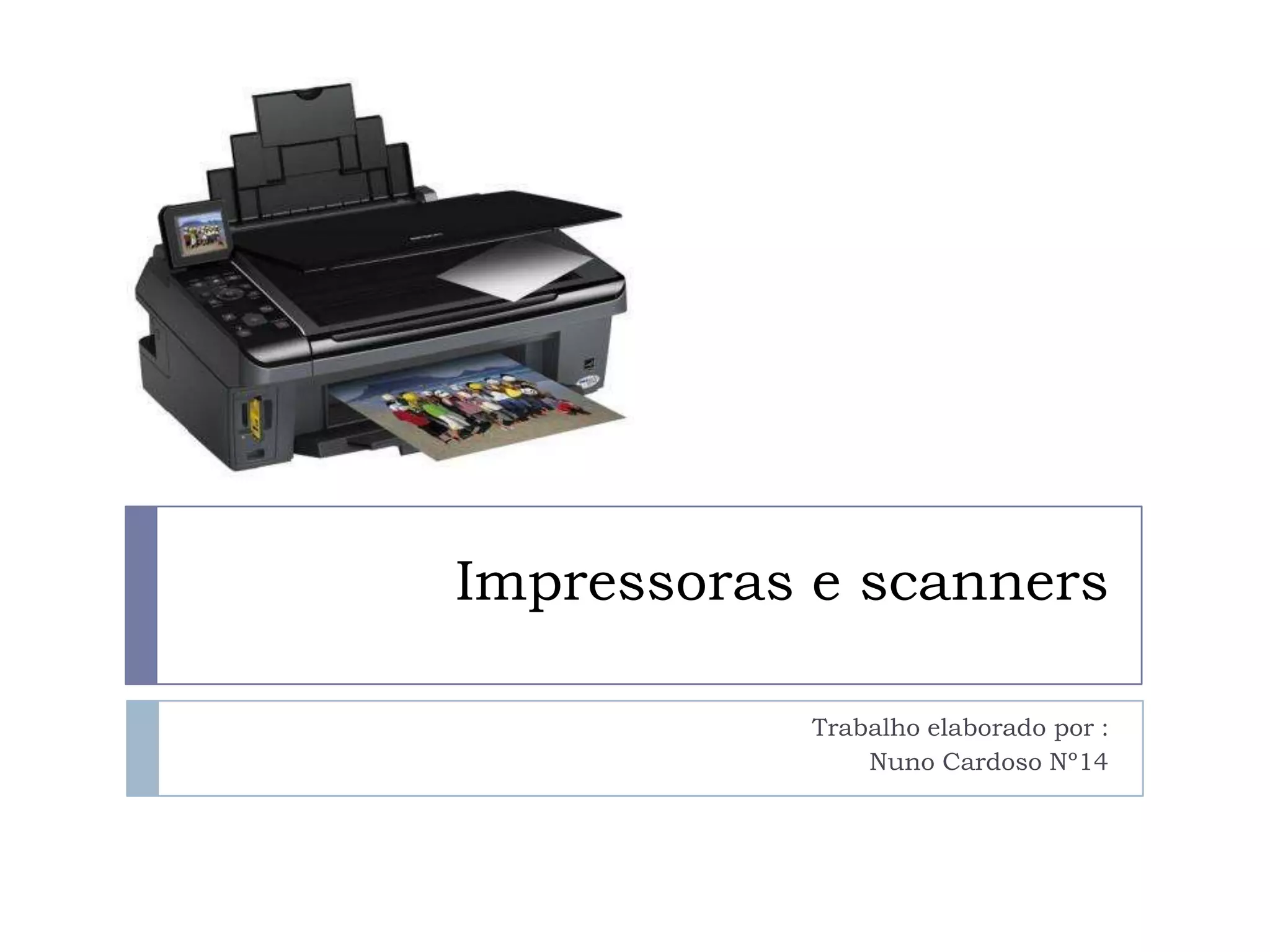 O documento descreve características e tipos de impressoras, scanners e suas diferenças. Impressoras podem ser a jato de tinta ou a laser, variando em resolução, velocidade, tamanho e preço. Scanners digitalizam documentos e também variam em resolução, tamanho suportado e conectividade.
