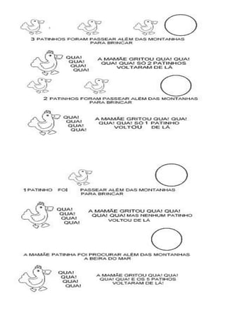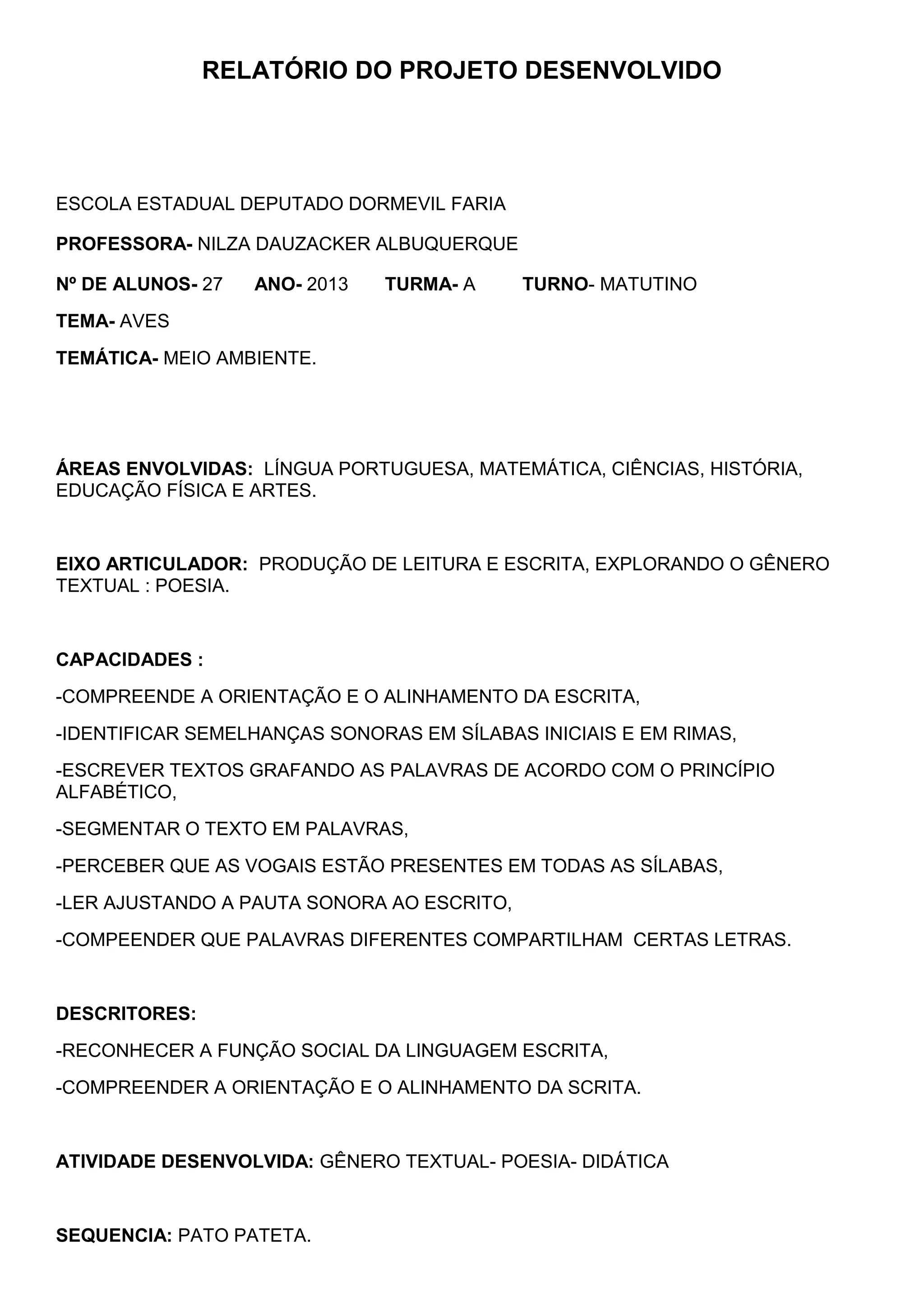 O relatório descreve um projeto desenvolvido com alunos do ensino fundamental sobre aves. O projeto abordou temas de língua portuguesa, matemática, ciências, história e educação física com foco na produção de leitura e escrita de poemas. As atividades desenvolvidas incluíram a leitura e análise de uma poesia sobre um pato, assistir a um filme sobre o pato Donald e realizar exercícios de escrita e reconhecimento de letras.