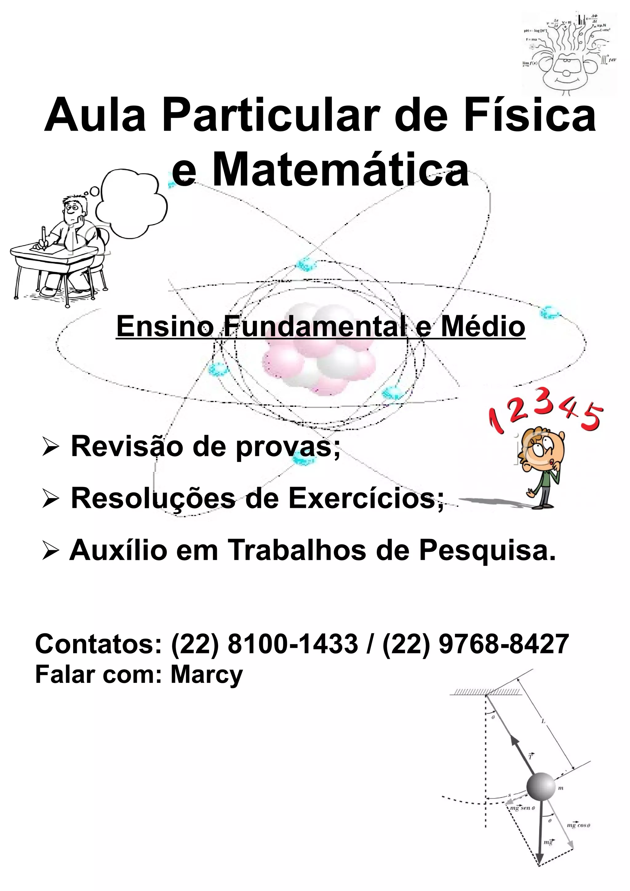 Marcy oferece aulas particulares de Física e Matemática para Ensino Fundamental e Médio, incluindo revisão de provas, resolução de exercícios e auxílio em trabalhos de pesquisa, e pode ser contatada pelos telefones (22) 8100-1433 ou (22) 9768-8427.