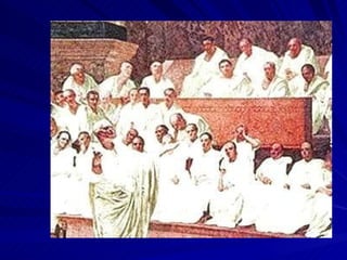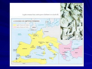 O documento descreve a história da civilização romana desde sua fundação por Rômulo e Remo até sua queda no século V d.C. Aborda a estrutura política da Monarquia, República e Império, as lutas sociais entre patrícios e plebeus, as conquistas territoriais, as dinastias imperiais e a divisão final do império em ocidental e oriental.