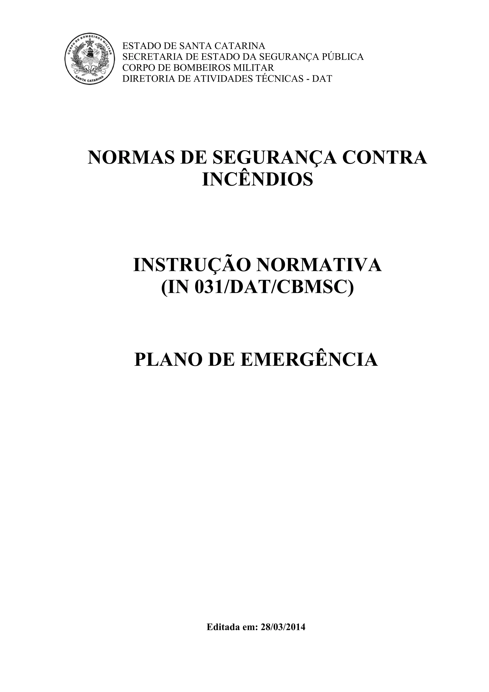 Este documento estabelece critérios mínimos para elaboração e implantação de Planos de Emergência em Santa Catarina, incluindo procedimentos básicos de segurança, exercícios simulados, plantas de emergência e manutenção de sistemas preventivos.