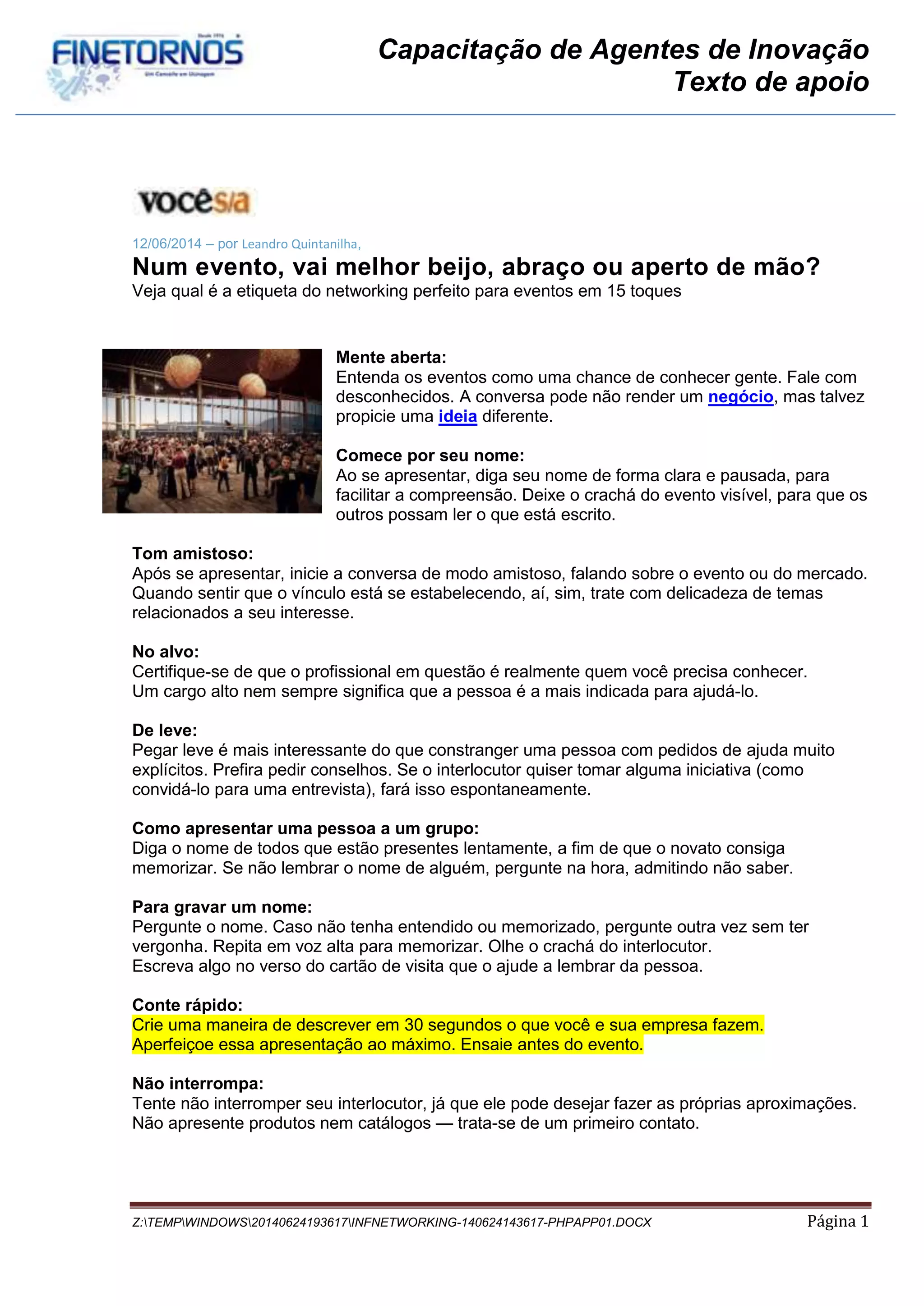 Este documento fornece dicas sobre como se comportar em eventos de networking de forma a estabelecer conexões profissionais de forma eficaz. Ele recomenda começar apresentando-se claramente, iniciar conversas de forma amistosa e demonstrar interesse genuíno na outra pessoa. Também enfatiza a importância de ser breve e direto ao se apresentar e fazer perguntas, e manter contato após o evento por meio das redes sociais.
