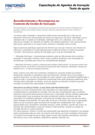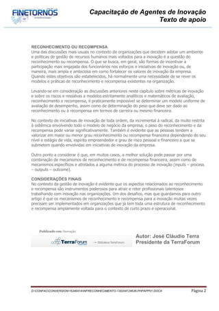 Reconhecimento e recompensa são importantes para incentivar a inovação, mas devem ser usados de forma estratégica. A motivação intrínseca, como o interesse no trabalho, é mais eficaz do que recompensas externas. Iniciativas inovadoras nem sempre dão certo e não devem ser punidas, desde que sigam processos estabelecidos. Uma combinação de reconhecimento e recompensa financeira geralmente funciona melhor do que apenas um ou outro.