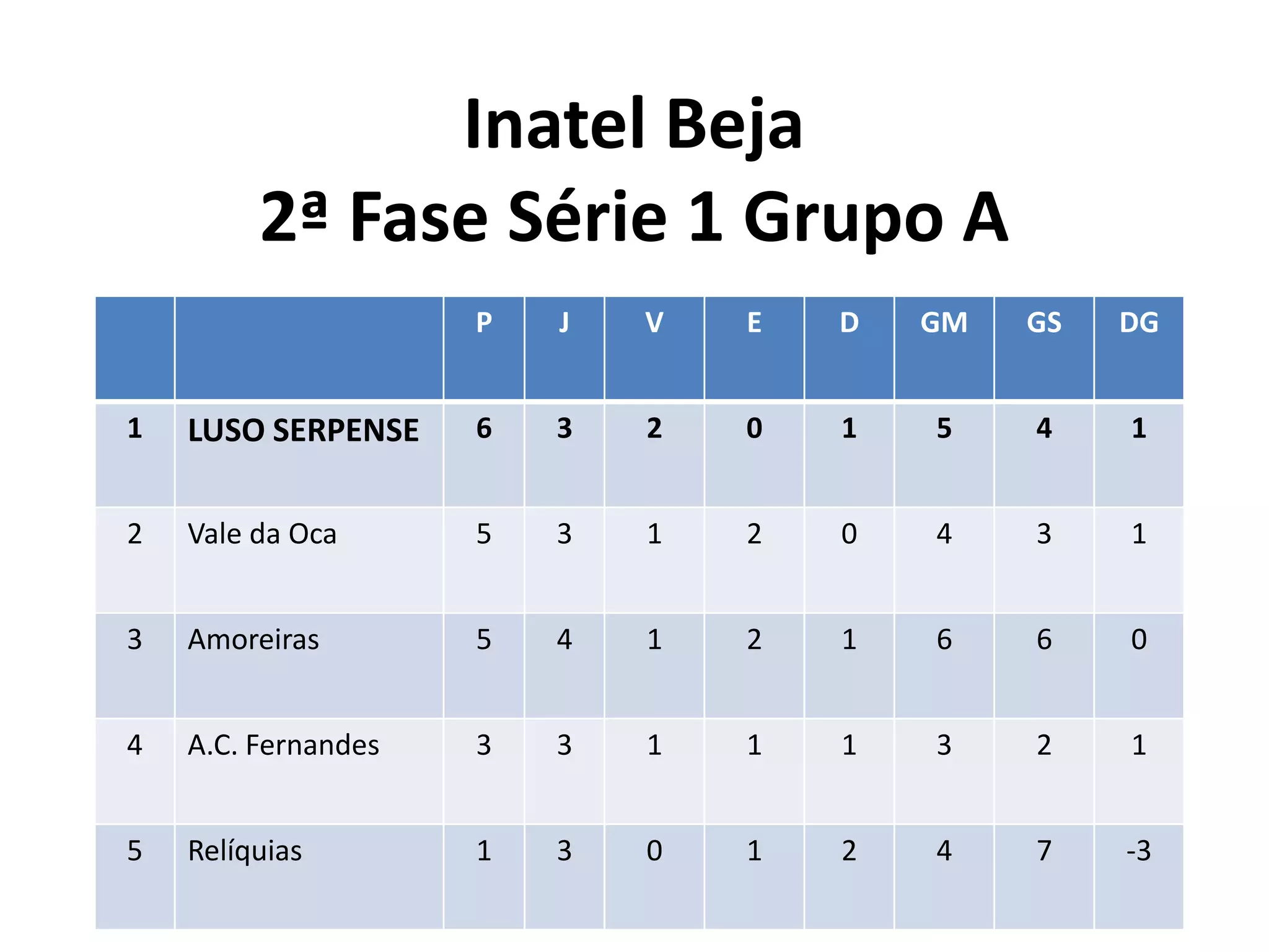 A tabela classificativa da 2a Fase Série 1 Grupo A do campeonato Inatel Beja lista os 5 clubes participantes com suas partidas jogadas, vitórias, empates, derrotas, gols marcados e sofridos. O Luso Serpense lidera a tabela com 2 vitórias, 0 empates e 1 derrota, tendo marcado 5 gols e sofrido 4.