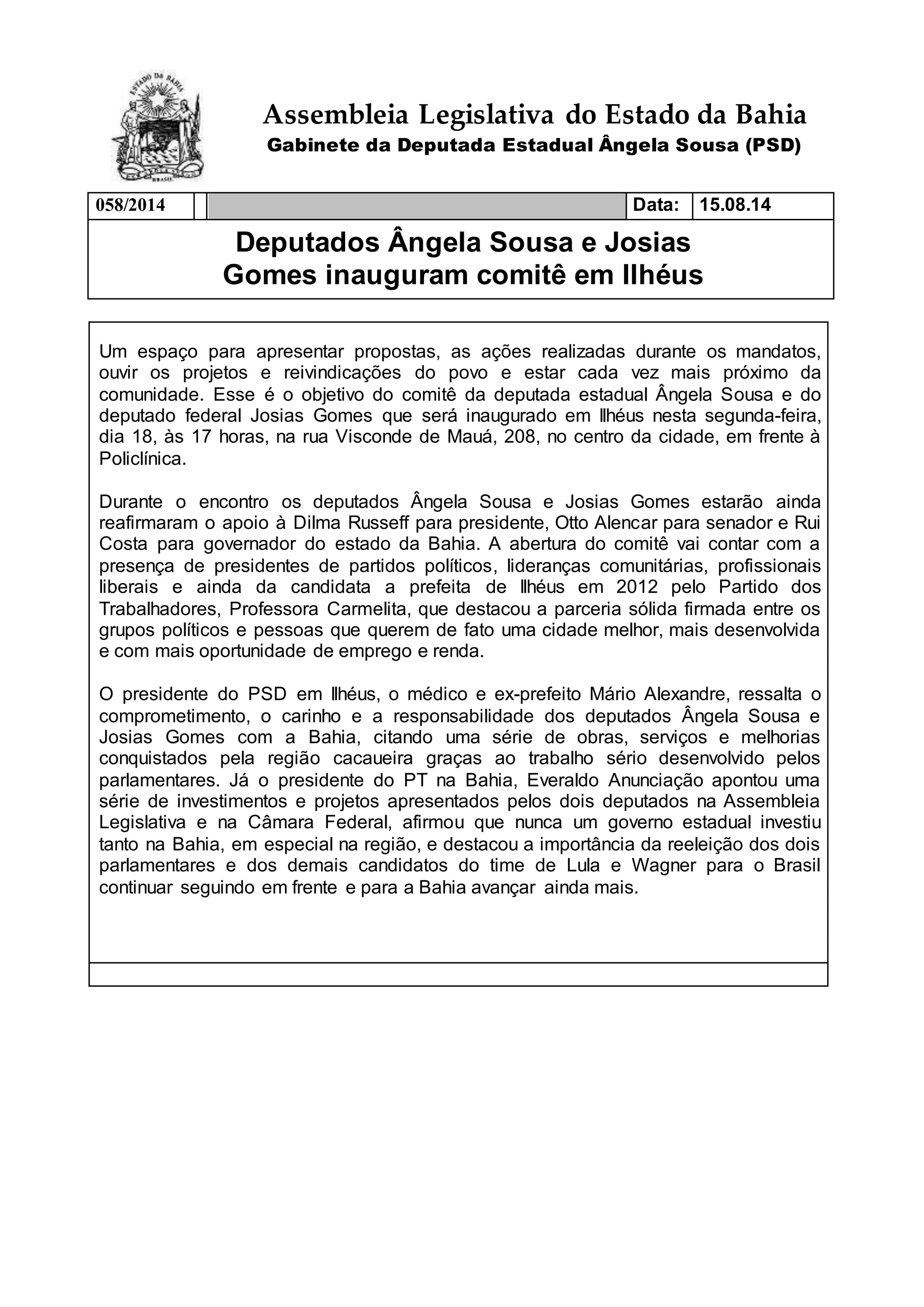 Os deputados Ângela Sousa e Josias Gomes inauguraram um comitê em Ilhéus para apresentar propostas e ouvir a comunidade. Eles reafirmaram o apoio a Dilma Rousseff, Otto Alencar e Rui Costa. Líderes políticos elogiaram o trabalho dos deputados e destacaram a importância da reeleição deles.