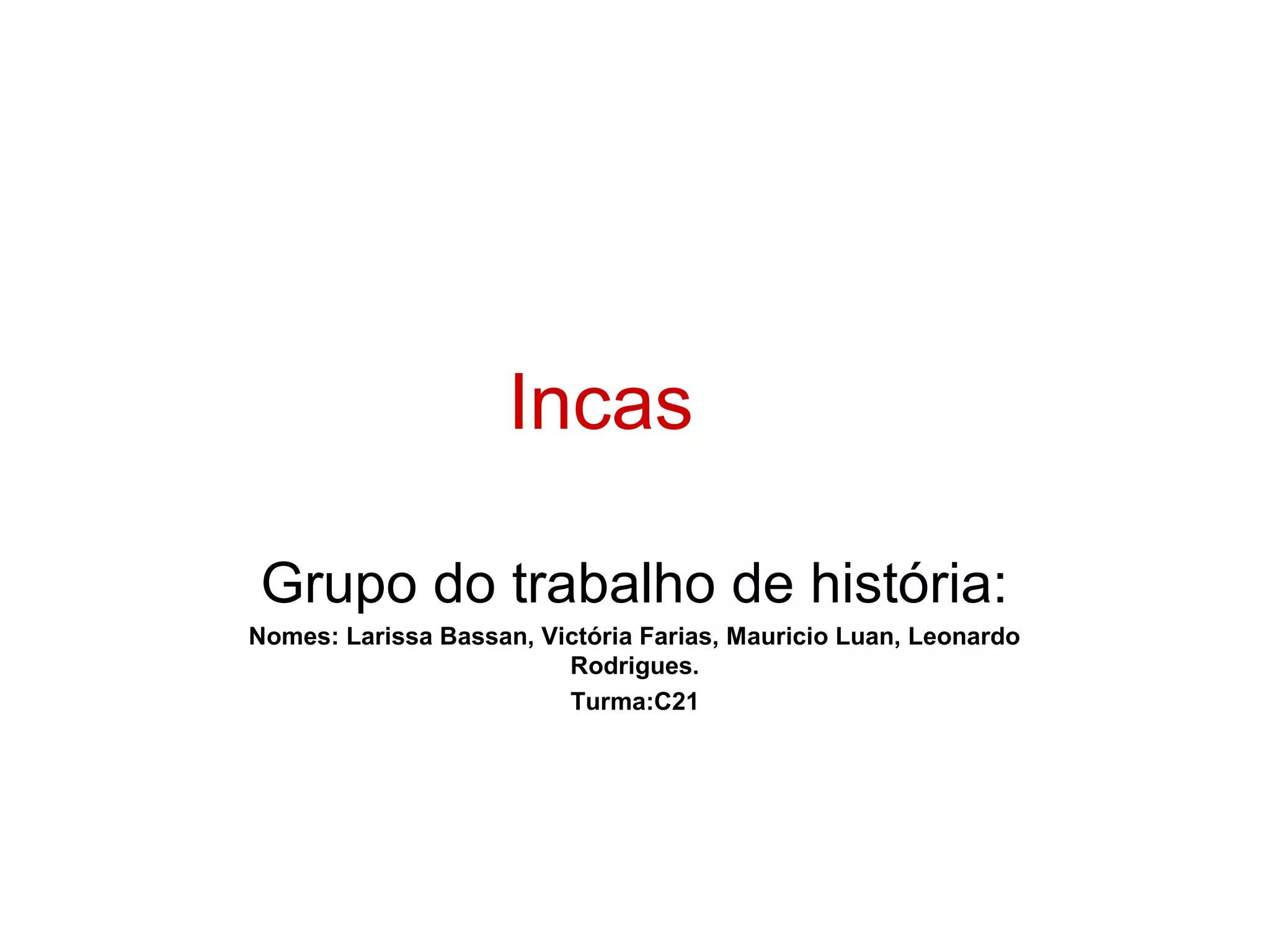 O documento descreve a civilização inca, destacando sua arquitetura, sistema agrícola e organização social. Os incas, originários do Peru, expandiram seu império sob o comando do imperador Pachacuti, enfrentando a conquista espanhola que levou ao seu colapso. A sociedade inca era caracterizada por uma rica tradição cultural, religião politeísta e uma economia baseada em tributos e trocas.