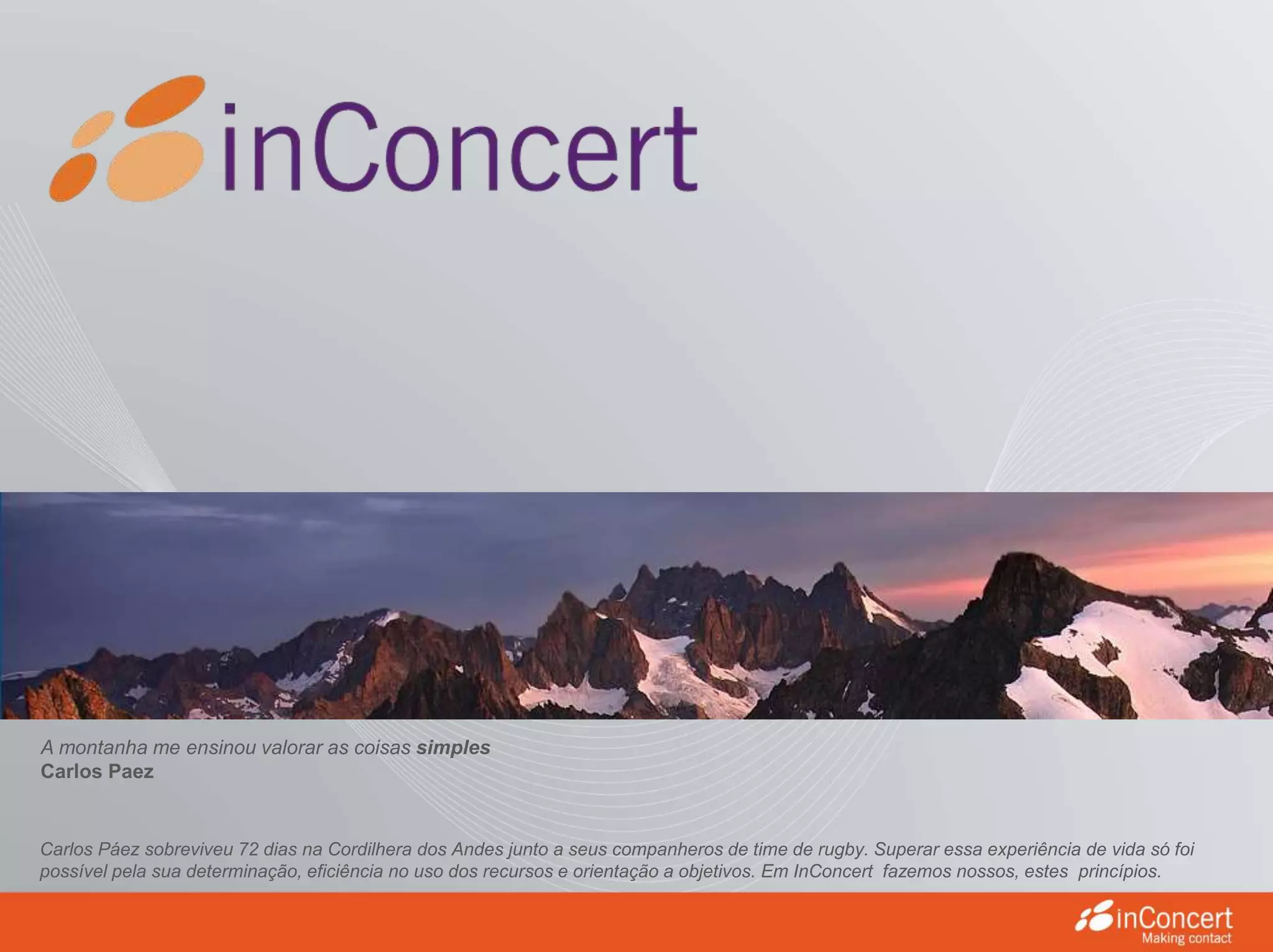 O documento apresenta os princípios da empresa InConcert para o desenvolvimento de software de centros de contato. Resume sua história, presença internacional e dados corporativos, além de descrever sua tecnologia de ponta a ponta para a gestão de múltiplos canais de comunicação.