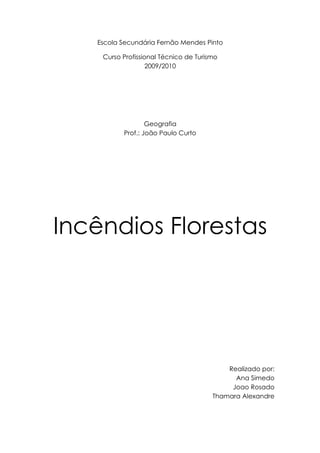 O documento discute incêndios florestais, definindo-os como incêndios em zonas naturais com abundante vegetação. Ele lista as principais causas como relâmpagos, descuidos humanos e queimadas intencionais, e fatores como vento, baixa umidade e altas temperaturas que contribuem para a propagação. O documento fornece dicas sobre como prevenir e combater incêndios florestais, e o que fazer ao se deparar com um incêndio.
