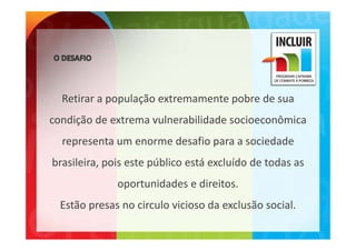 O documento descreve o Programa Capixaba de Combate à Pobreza no Espírito Santo, que tem como objetivo promover a redução da pobreza e inclusão social através da emancipação de famílias extremamente pobres. O programa irá selecionar famílias com renda per capita inferior a R$70 através do Cadastro Único e oferecerá transferência de renda, acesso a serviços do estado, e inclusão produtiva para promover a autonomia das famílias.