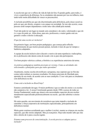 O documento discute a inclusão escolar no Brasil segundo a educadora Maria Teresa Mantoan. Ela defende que a inclusão traz benefícios para todos ao permitir que estudantes convivam com as diferenças. No entanto, o Brasil ainda caminha devagar na implementação da inclusão, com escolas que não cumprem a lei de garantir o acesso de todos.